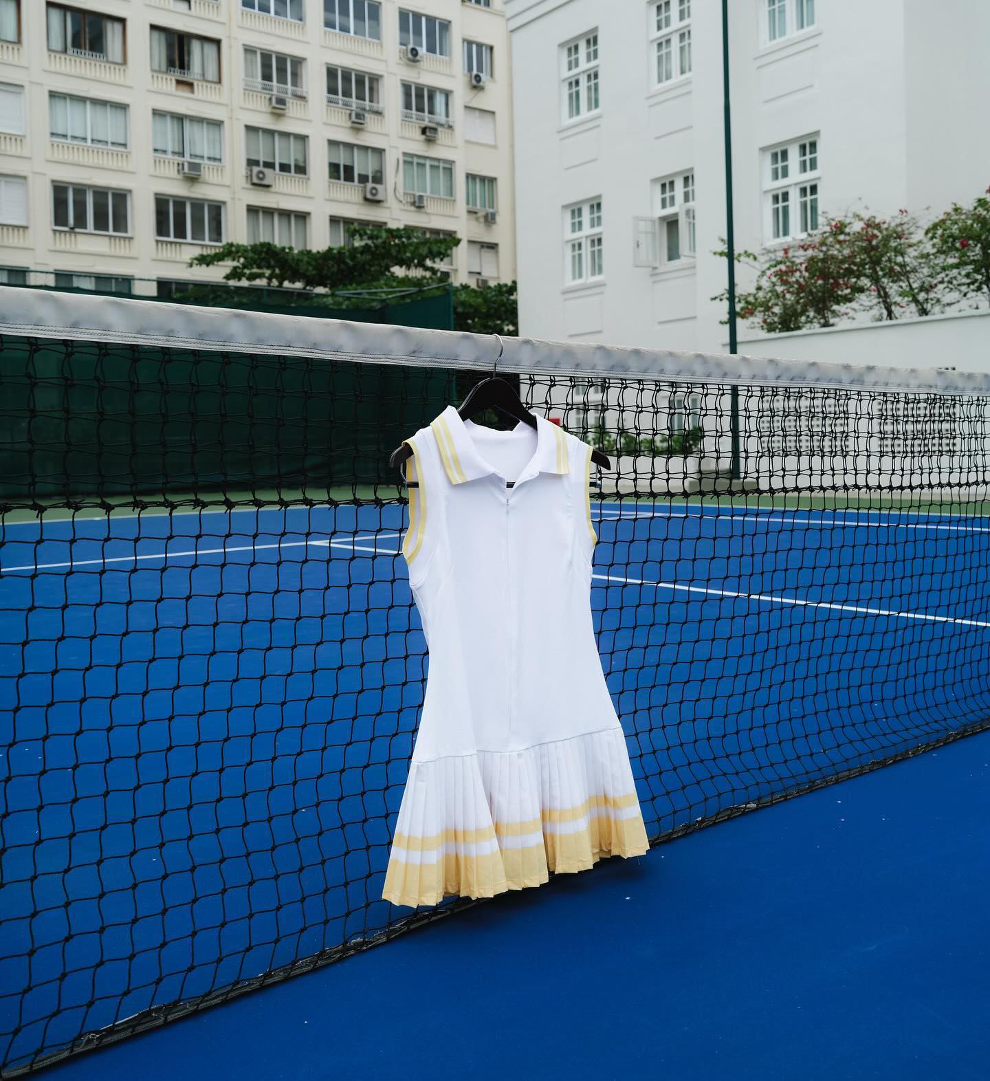 The Bria Dress is a classic tennis dress with a retro feel. This breezy dress keeps you comfortable on the court with a contrast polo collar, a zip placket in the front, and a pleated mini A-line silhouette. This dress also has built-in shorts underneath with a pocket.
