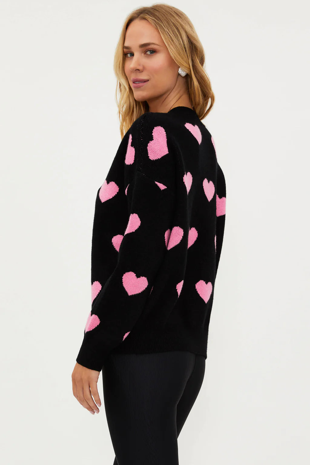 Our best-selling Joey sweater is now available in black with baby pink hearts printed all over. This sweatshirt features a v-neckline with an oversized fit made from an ultra-soft knitted fabric.