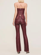 Saffron Coated is a wax coated, deep red denim with a leather-like look. It features silver zipper, tonal stitching and clean finishing.
