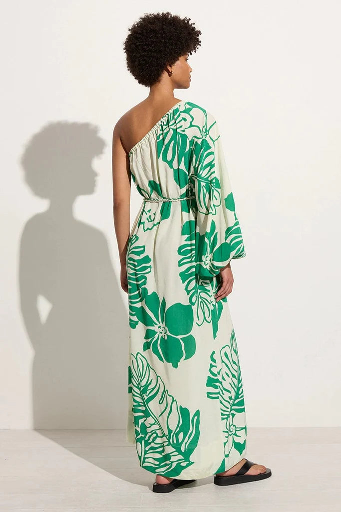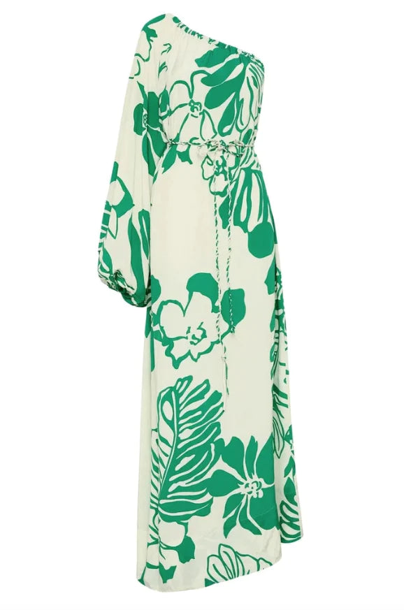 The Masika Maxi Dress is a floral one-shoulder maxi dress with a voluminous silhouette, elasticated neckline, twisted waist tie and an exaggerated lantern sleeve for a statement effect. Mindfully made from environmentally responsible viscose and splashed with large-scale tropical florals, the Masika is an elevated vacation or event wear style.