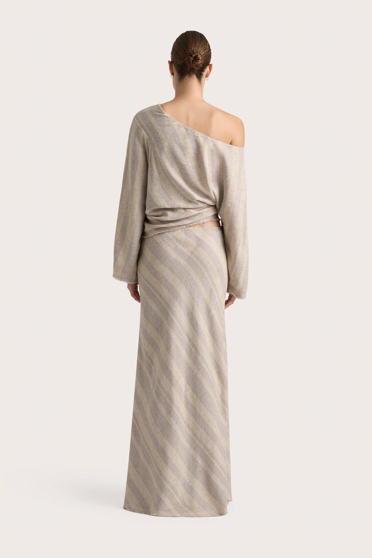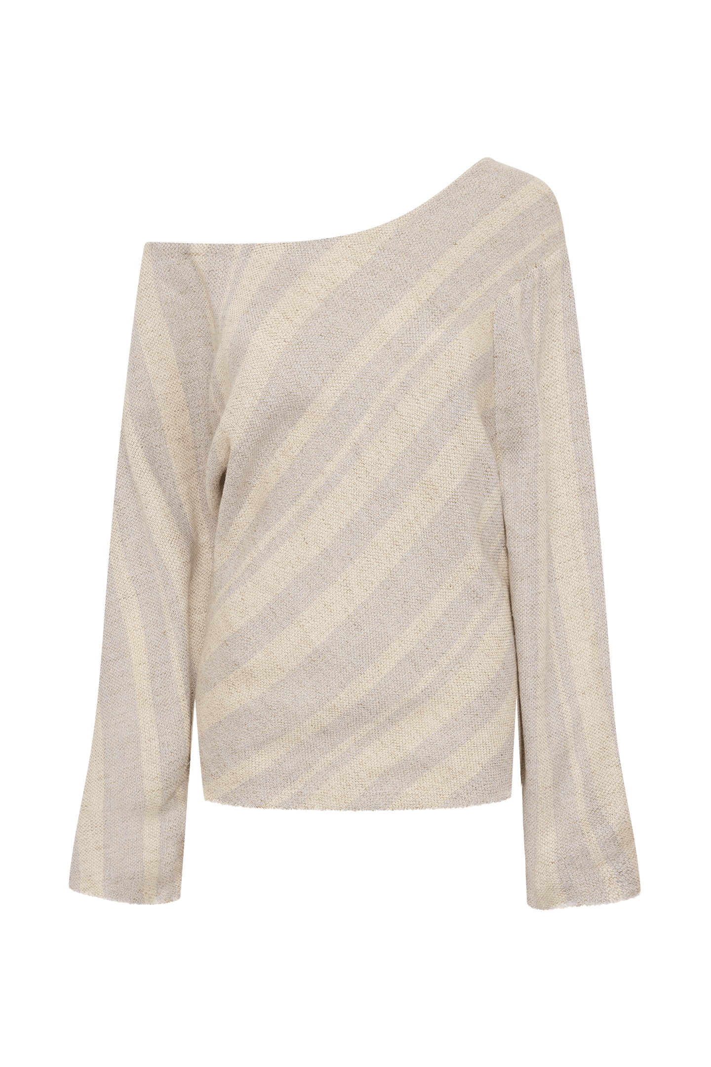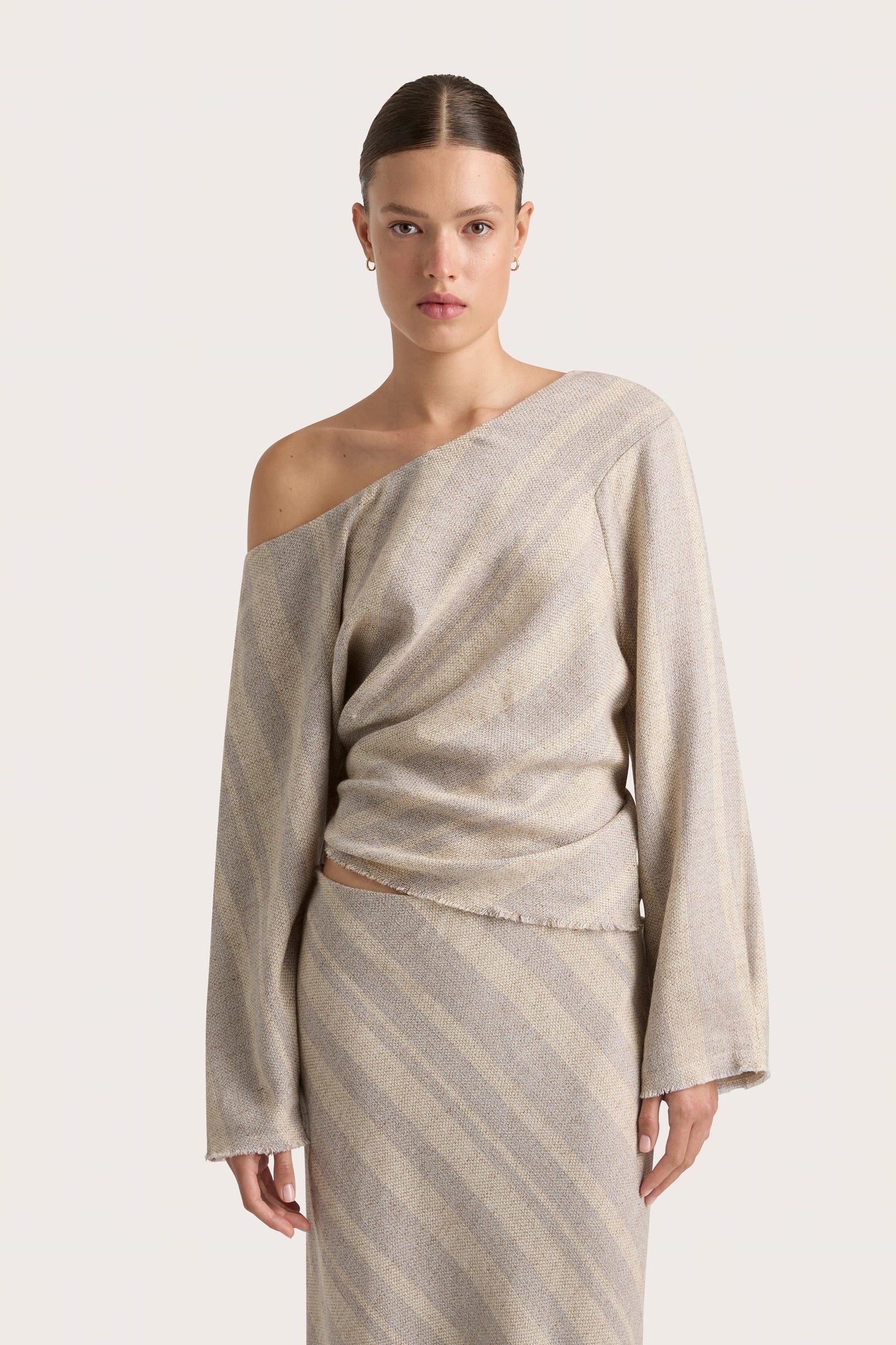 A relaxed long sleeve top, designed to be worn off-shoulder with a collapse of fabric beneath the arm. Crafted from a custom yarn-dyed cotton linen blend in Sand Sky Blue Stripe, it is a relaxed silhouette that sits comfortably at the waist with a raw hem. Style with swim or the Sao Paulo Skirt and Pant for effortless day to night wear