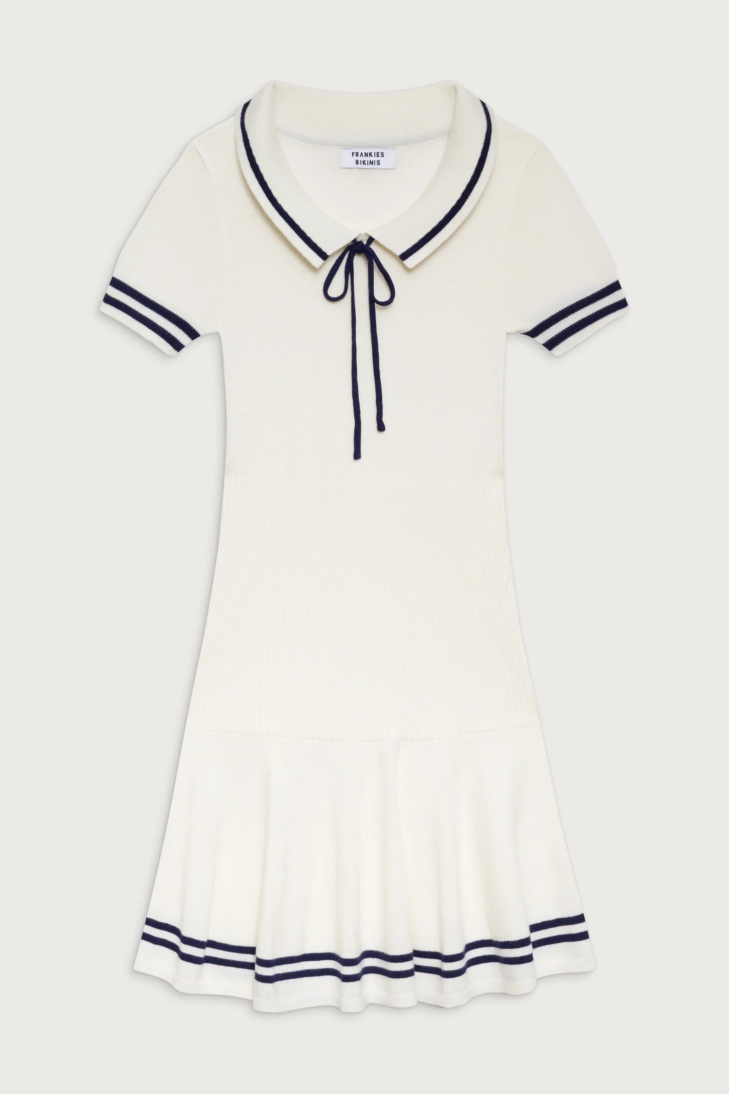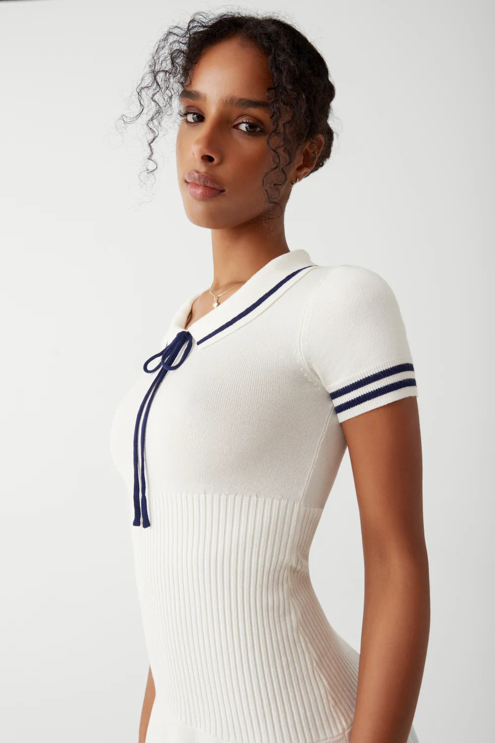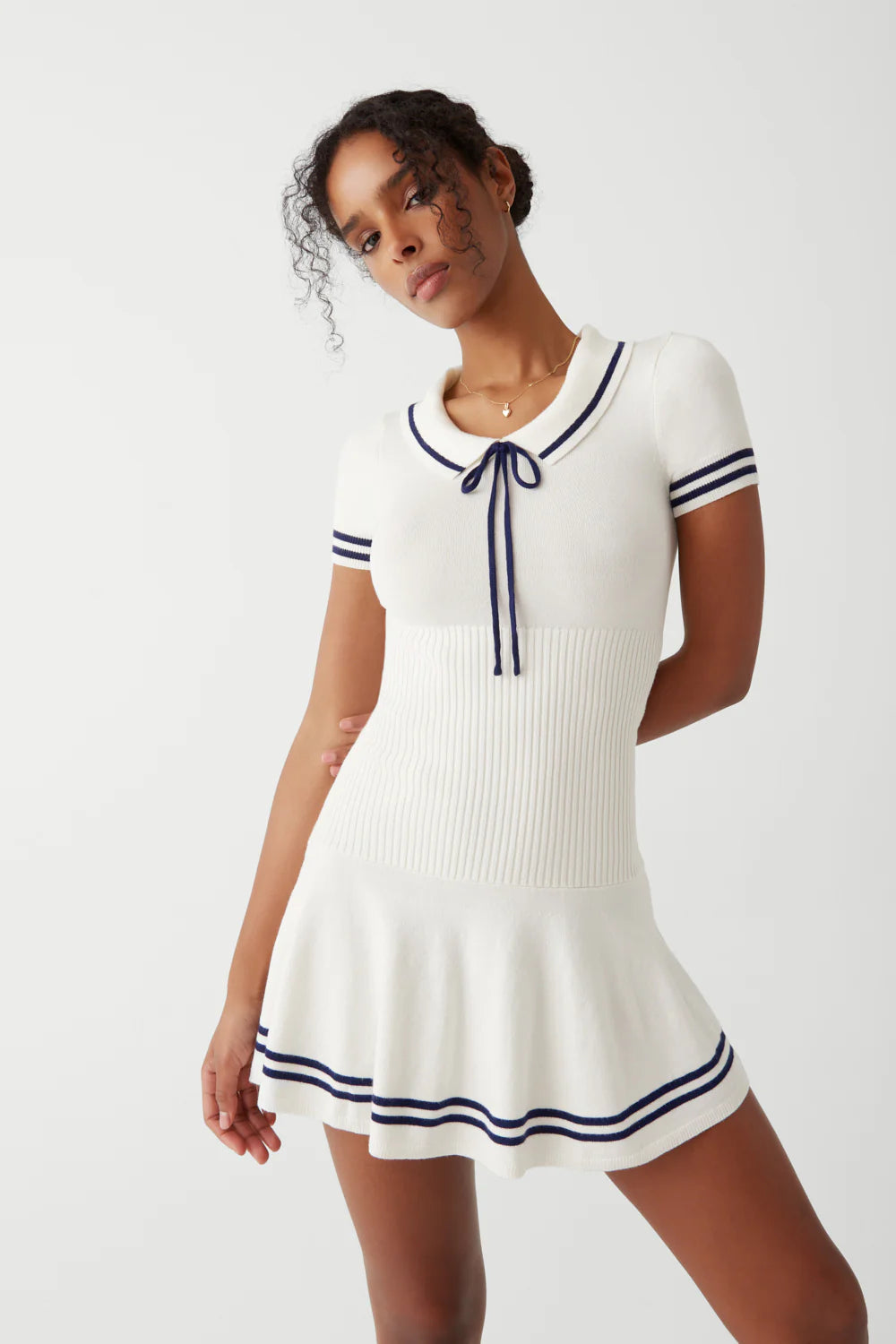 Introducing the Max dress, reminiscent of sailor-core with its collared neck, bow detail, and blue stripes. This lightweight knit dress features a figure-enhancing waist and a flutter skirt design. Pair this mini with ballet flats, and you'll be ready to embrace any spring day.