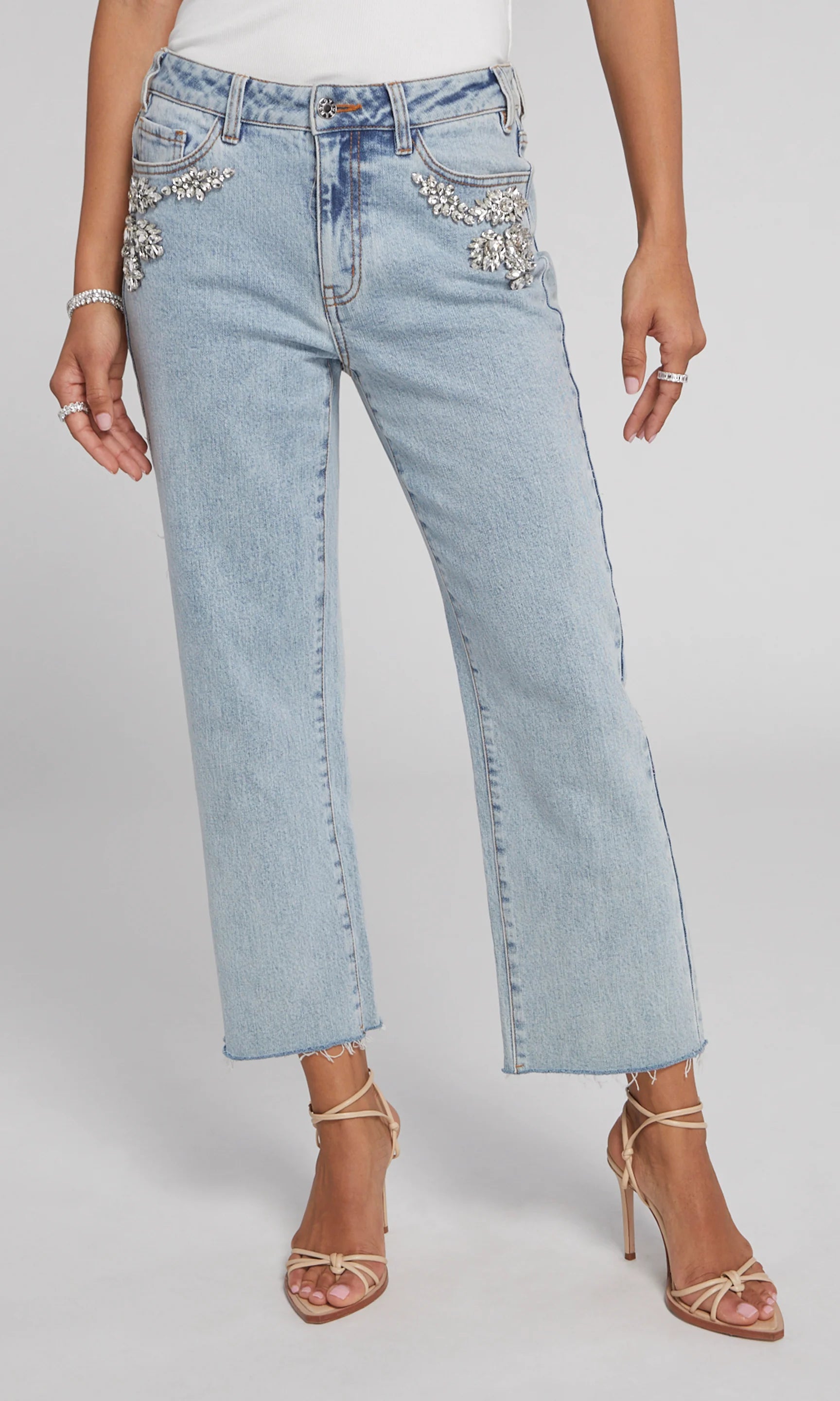 The Carolyn jeans aren't your everyday denim. Made in an on-trend straight leg silhouette with a raw hem and gorgeous crystal appliques on the front and back pockets, these bold bottoms are sure to bring a touch of glamour to any day of the week. Style with a tee and your favorite blazer for a preppy-meets-glitzy look.