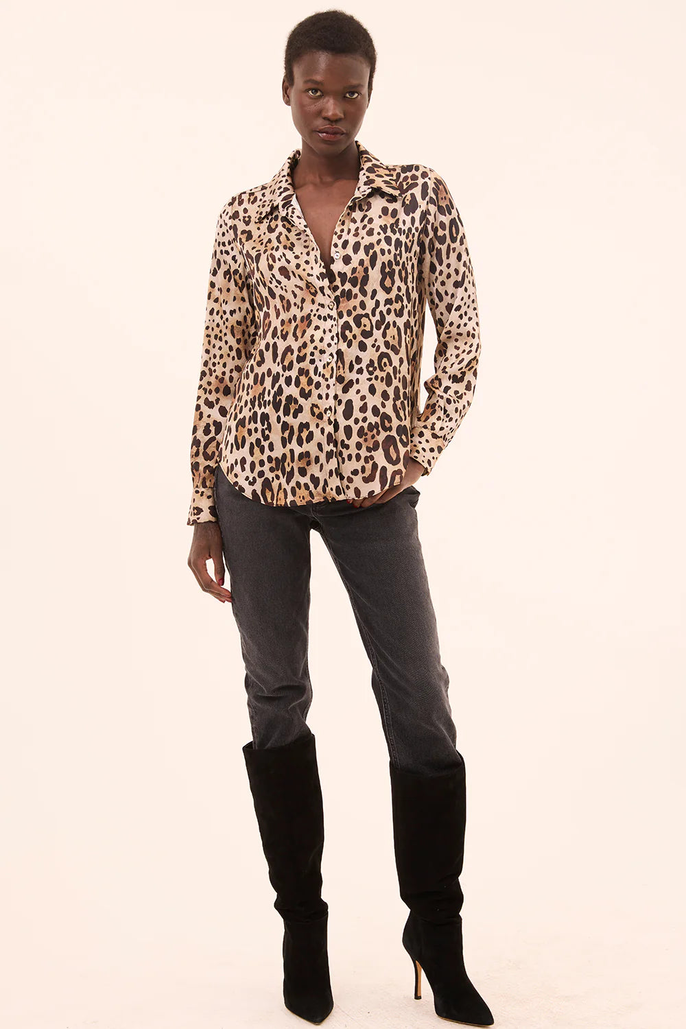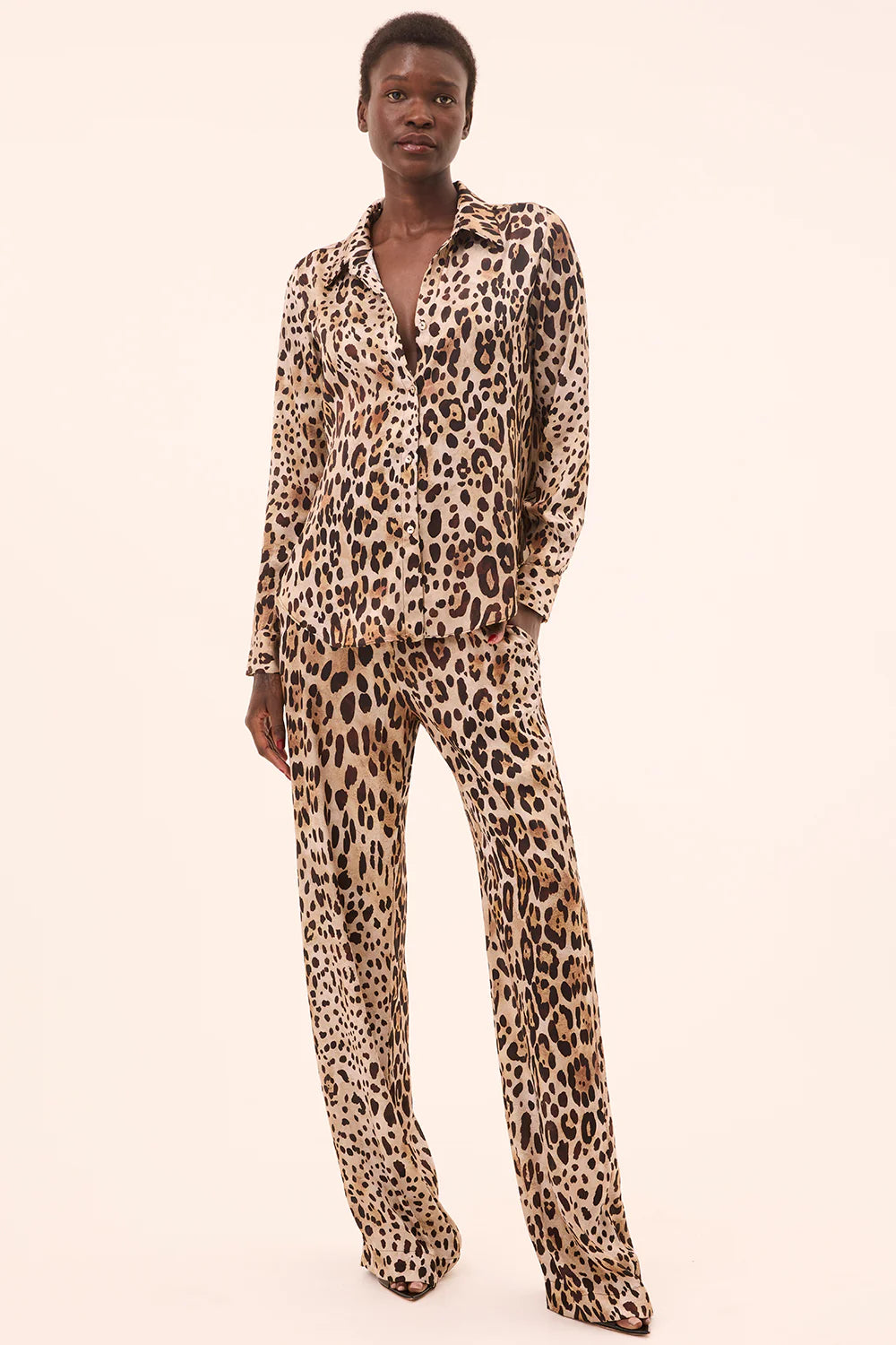 Our new Celine top is cut from a classic leopard printed satin. An elevated take on your favorite shirt, it features a classic fold-over collar and pearlized buttons for a polished finish. For a head-to-toe look, pair it with the coordinating Cher pant, or dress it down with your favorite jeans.
