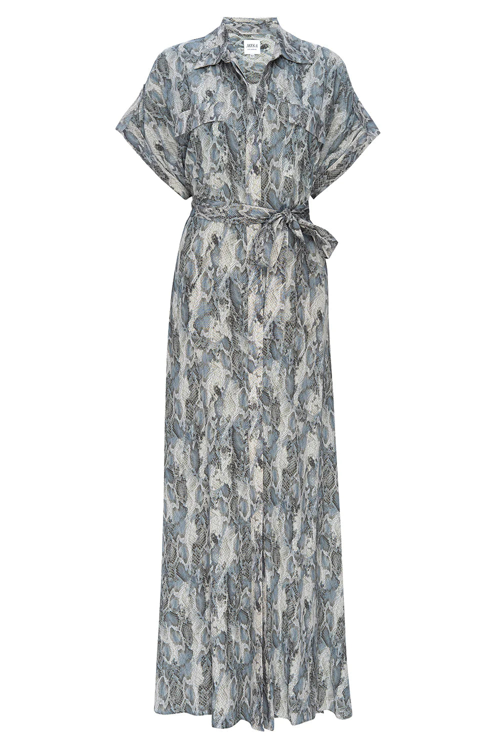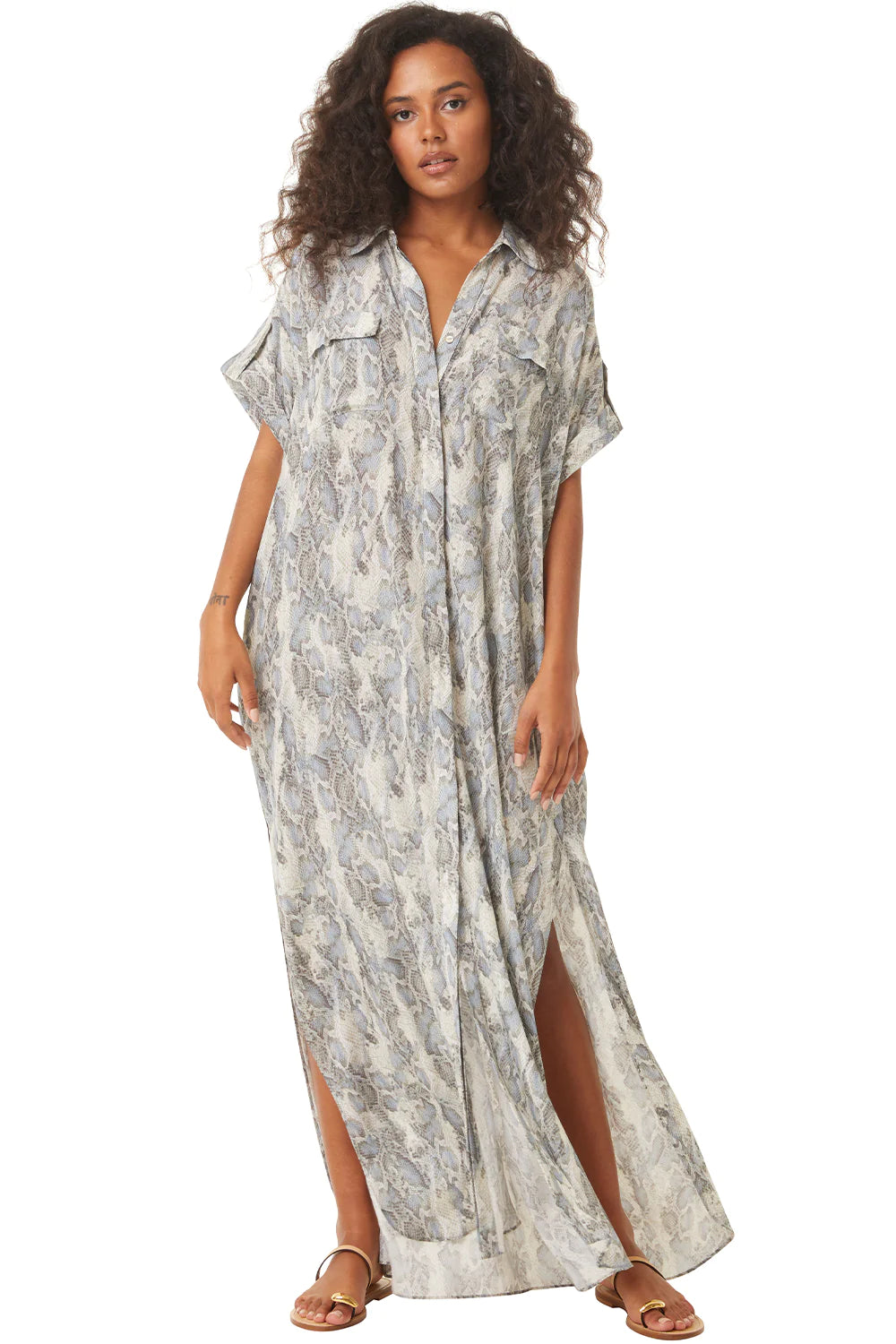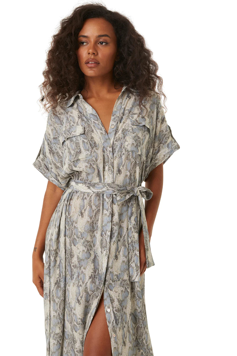 Our new Lou maxi dress is a modern update to the shirt dress cut from a cool Spring python print viscose blend. Short rolled sleeves feature epaulet details. A full covered button front with fold over collar and double flap front chest pockets. The long skirt features double side slits. Wear with the optional tie belt or undone as a chic cover-up. We will be wearing this style with everything from sandals to ballet flats and boots.