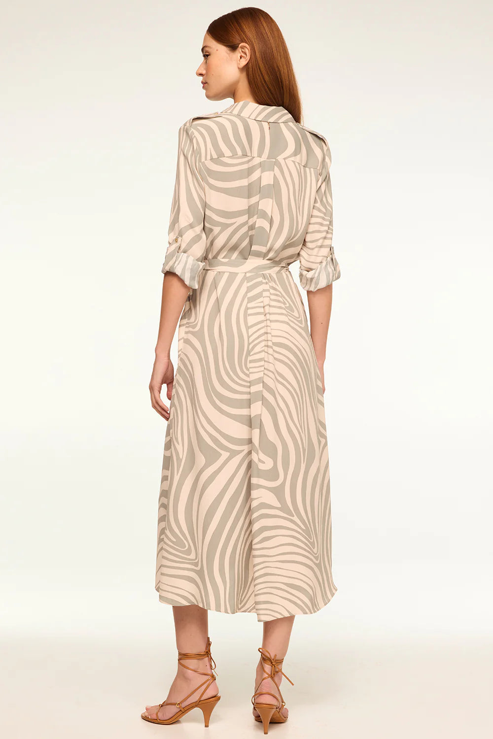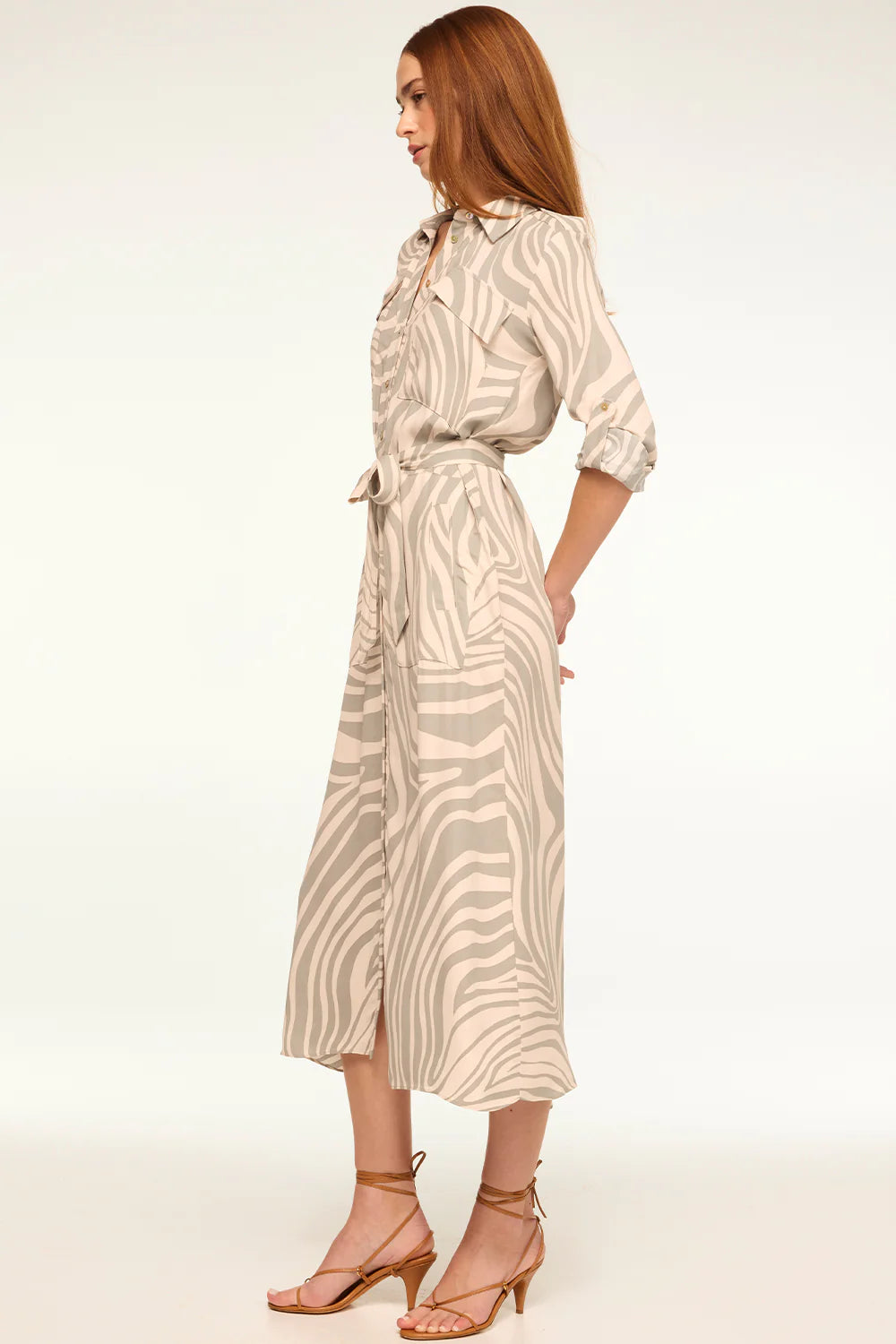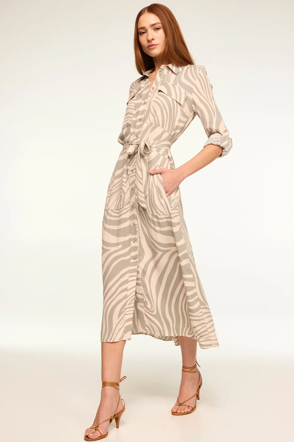 Introducing our effortlessly chic Montana midi dress; the perfect fusion of comfort and style. The shirt style collar and button-down front add a classic charm, making it versatile for both casual outings and formal occasions. Optional epaulet sleeve details at the elbow, double flap front chest pockets, double side slit pockets and an optional tie belt. Transition seamlessly from desk to dinner with this wardrobe essential. Cut from an ivory and sage abstract zebra viscose fabric. Style with a ballet flat, or pair with a heel for an elevated evening look.