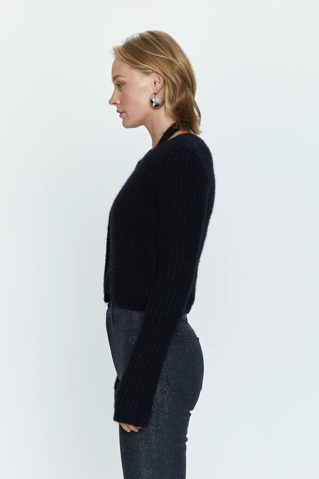 Two-in-one halter top and cardigan set crafted from a lightweight knit blend that creates a fuzzy, dimensional texture for sophisticated, yet playful posturing. Single button neckline closure.