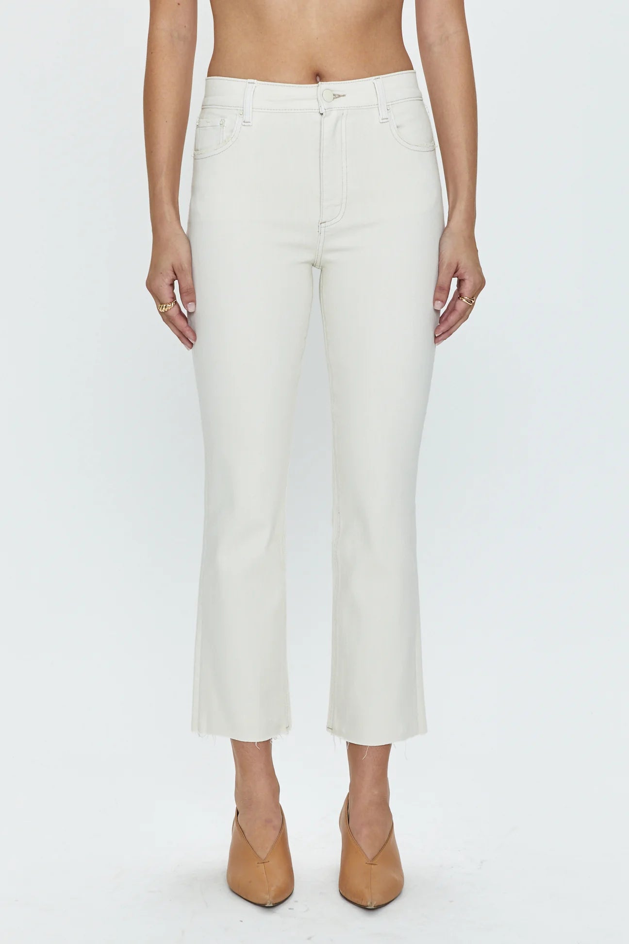 A pair you'll get endless wears out of. In a boot cut fit, it hugs you from the hips to knee and flares out at the calf for a proportional effect. Featuring a sandy white wash with contrast stitching, the high rise jean fits a polished, yet relaxed dress code.