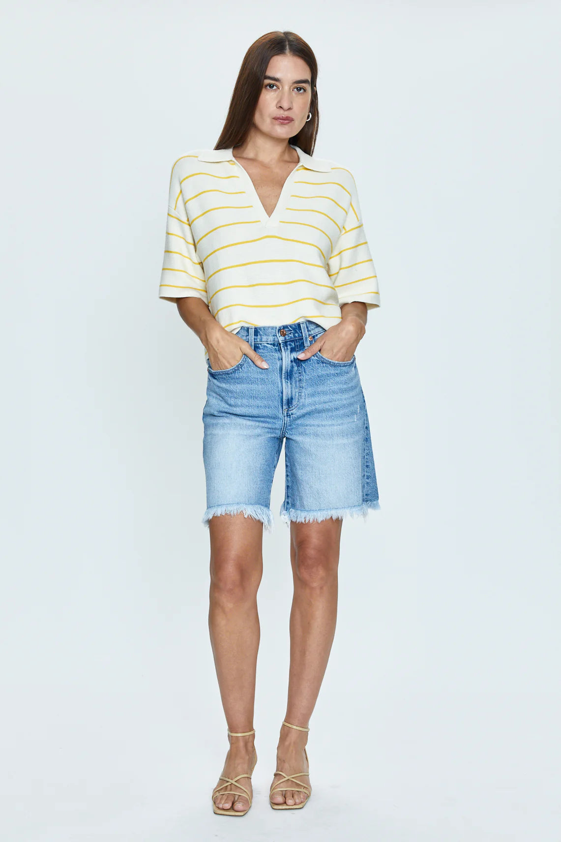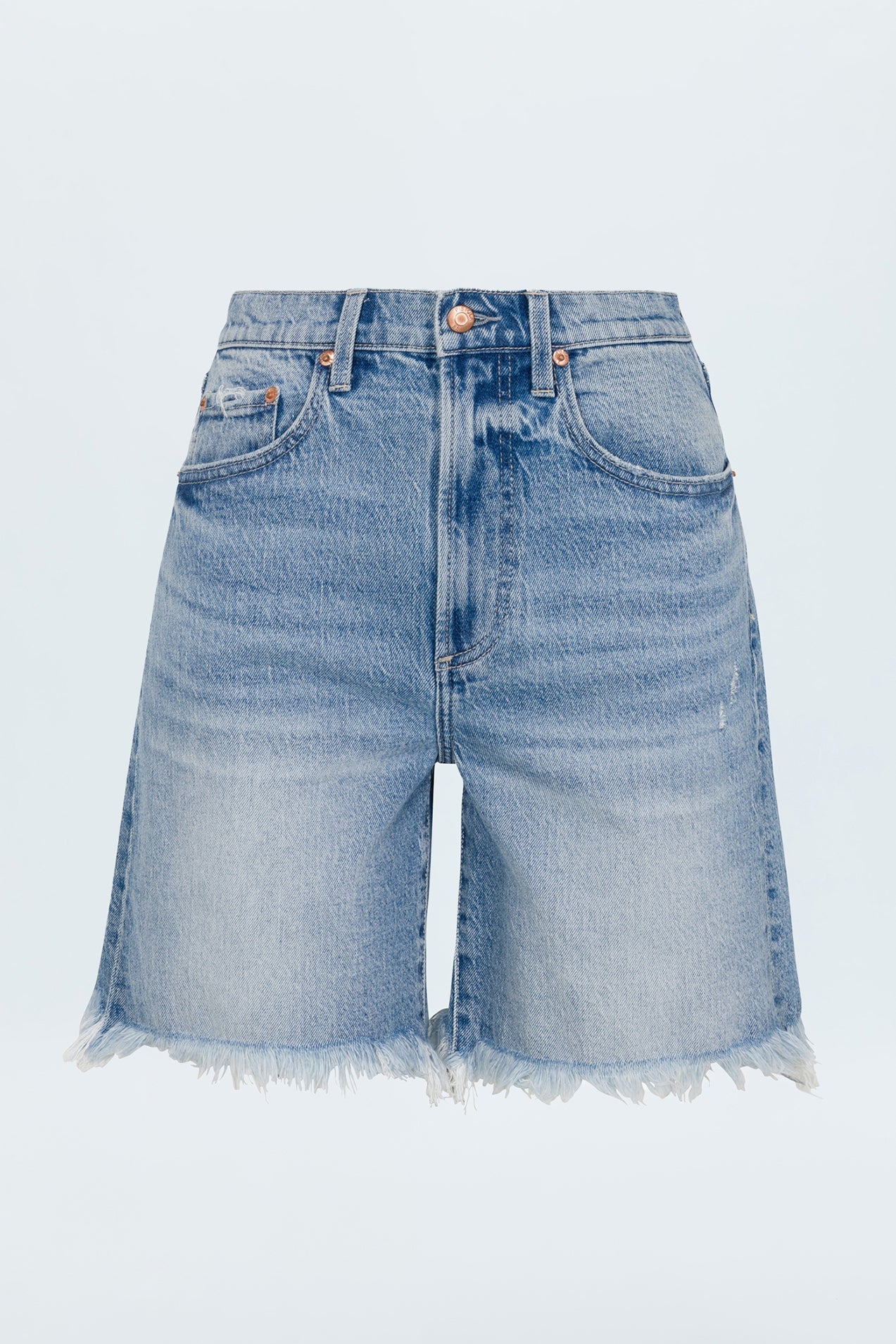 Now hitting cruising altitude. High rise, pinched waist short that falls into a long length, loose fit leg. Crafted from our signature comfort stretch denim for everyday wearability. Altitude Vintage is a light blue denim wash with crisp fading, light whiskering, and a frayed hem.