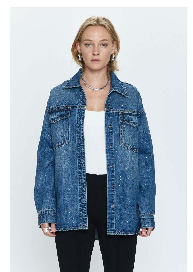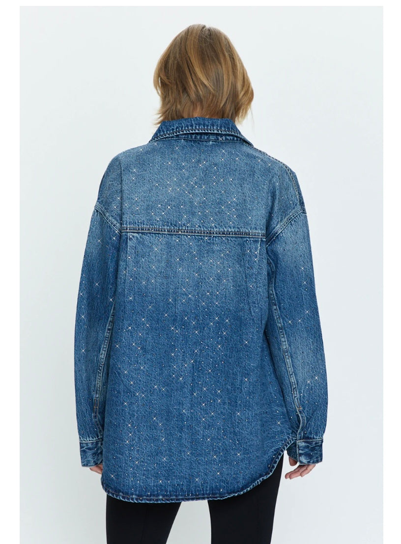 A menswear inspired denim jacket with a feminine spin of high shine Austrian crystals. The relaxed style has dropped shoulders that flow into sleeves just slightly long enough to add to the oversized element. With four pockets and the option to wear buttoned or layered, be prepared to get lots of wear out of this staple. We recommend sizing down for it to fit as pictured.