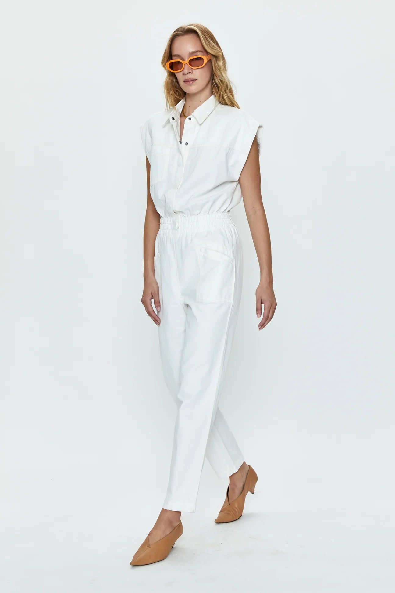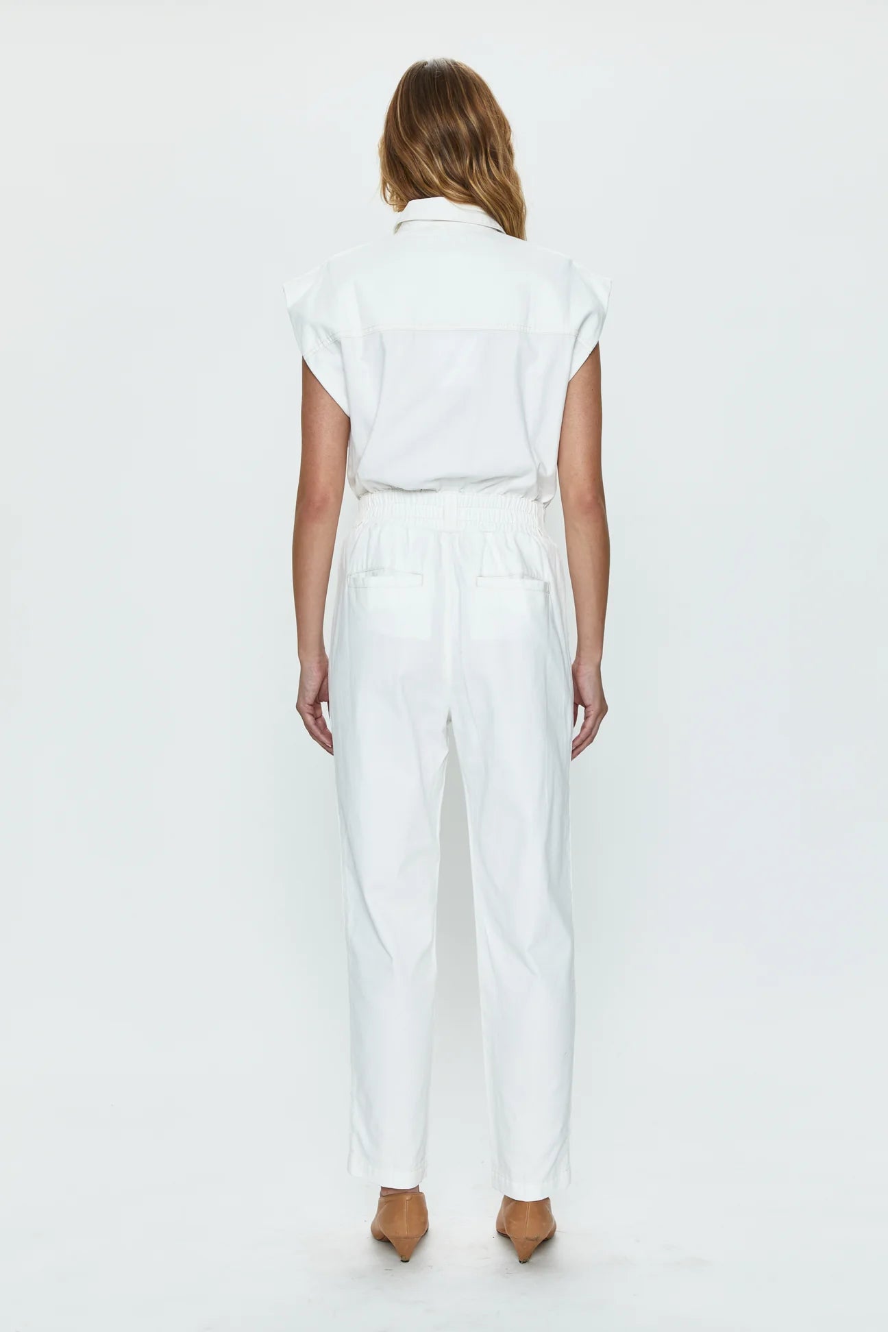 Feminine-forward jumpsuit silhouette featuring a cinching elastic waist, snap button front, and padded shoulders for powerful posturing that dresses up and down with ease.