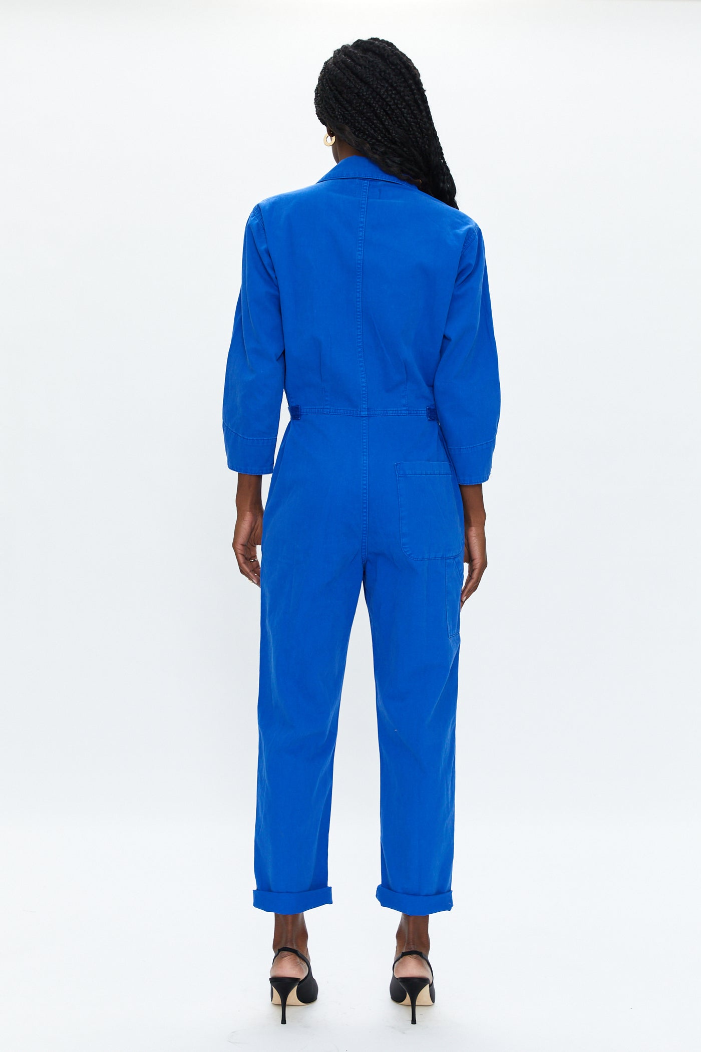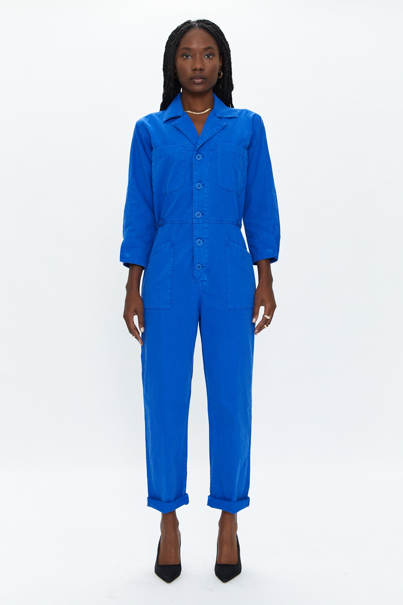 Tanner is the long sleeve version of a crowd favorite jumpsuit - The Grover. This vibrant blue one piece features a button front closure with adjustable straps on the side. Can be worn cinched at the waist or straight for a looser fit.