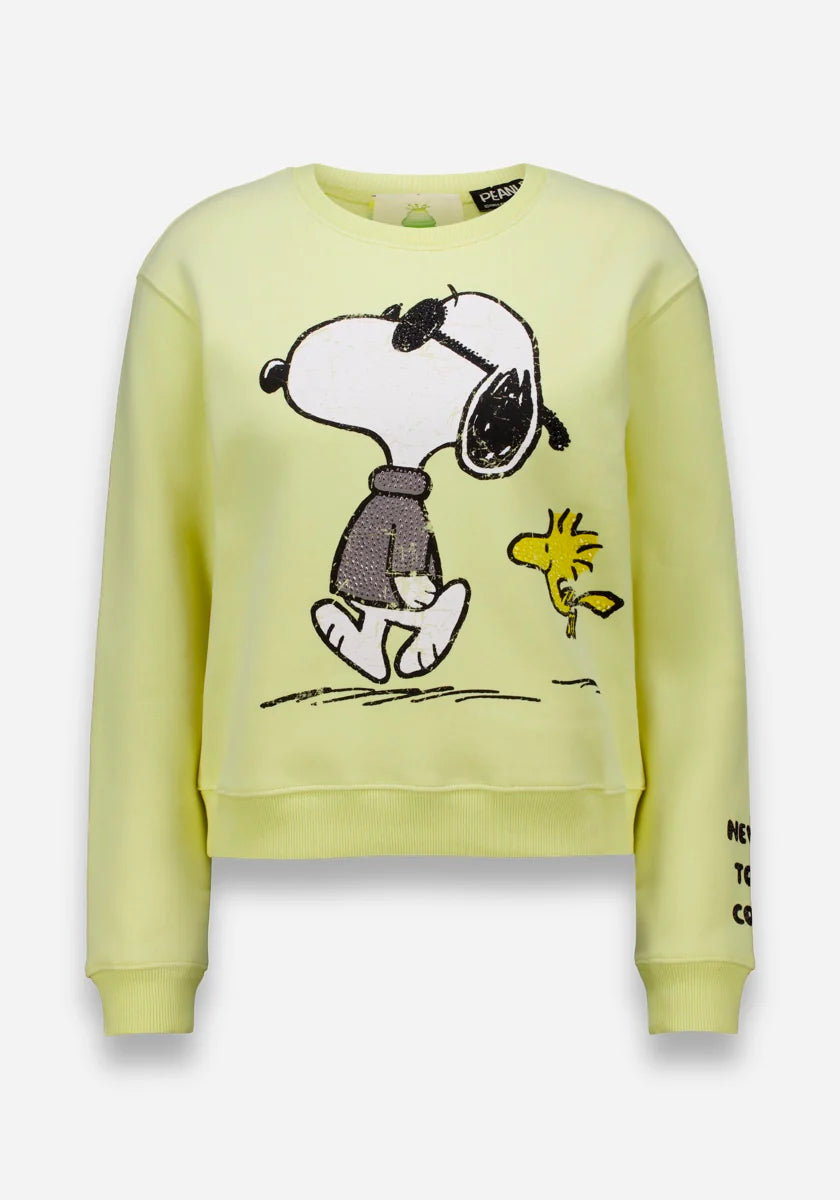 Sweatshirt with cotton content. Round neckline and long sleeves with dropped shoulders. Elastic waistband and hem. Snoopy and Woodstock print with rhinestone decoration. "Never too cool" - lettering on the left sleeve. Ribs at neckline, cuffs and hem.