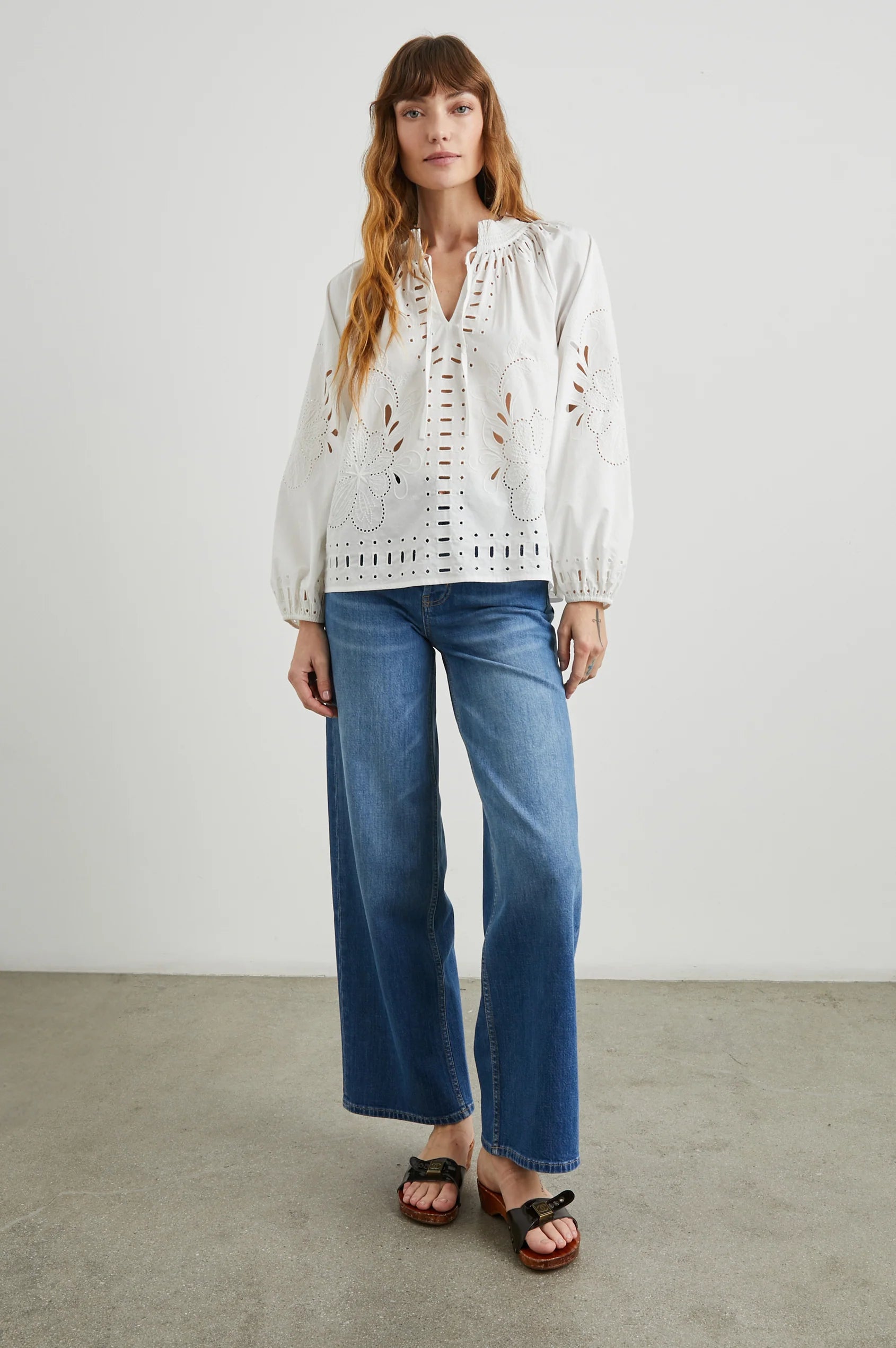 Top off your wardrobe with this cotton poplin beauty. Designed with billowy sleeves, a v-neckline, and eyelet cutouts, Lucinda is ready to elevate your everyday.
