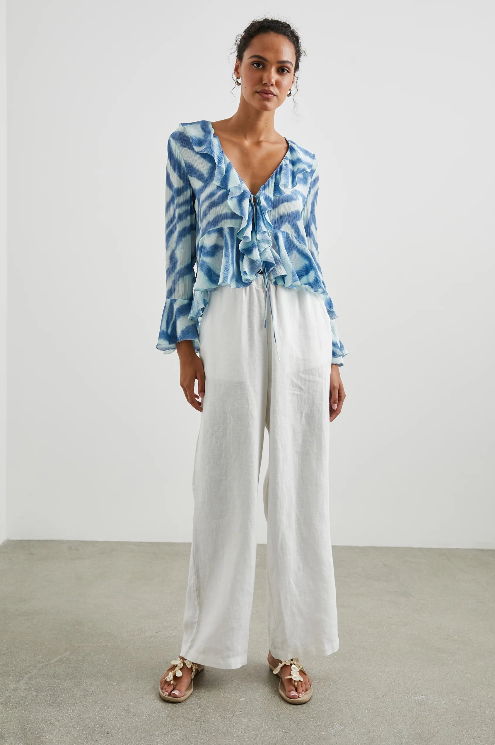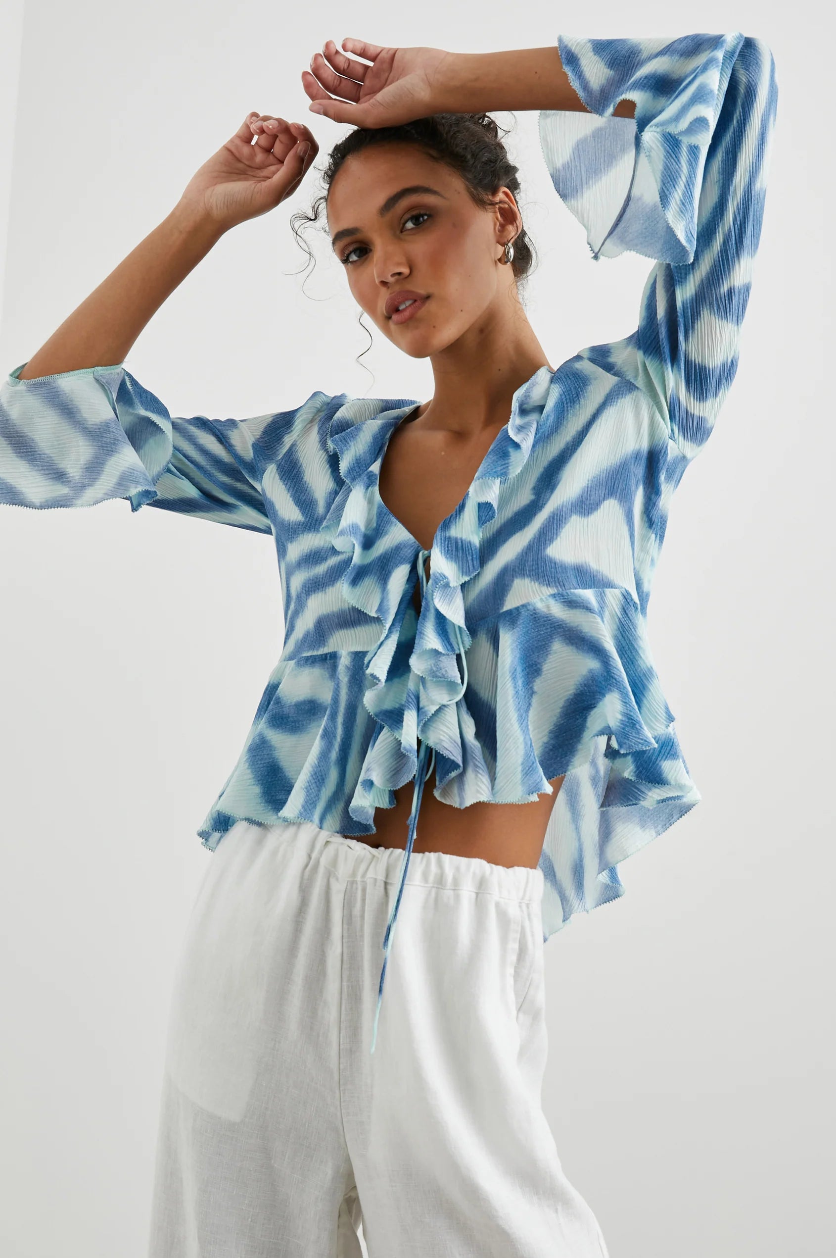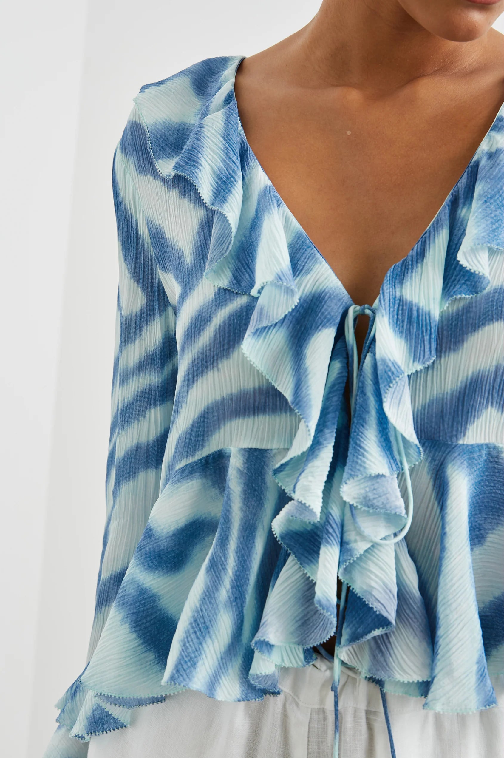 The sweetest style for festivities, the Nicoletta is made from beautiful chiffon fabric and features a wide v-neckline, front-tie, and cascading ruffle details.