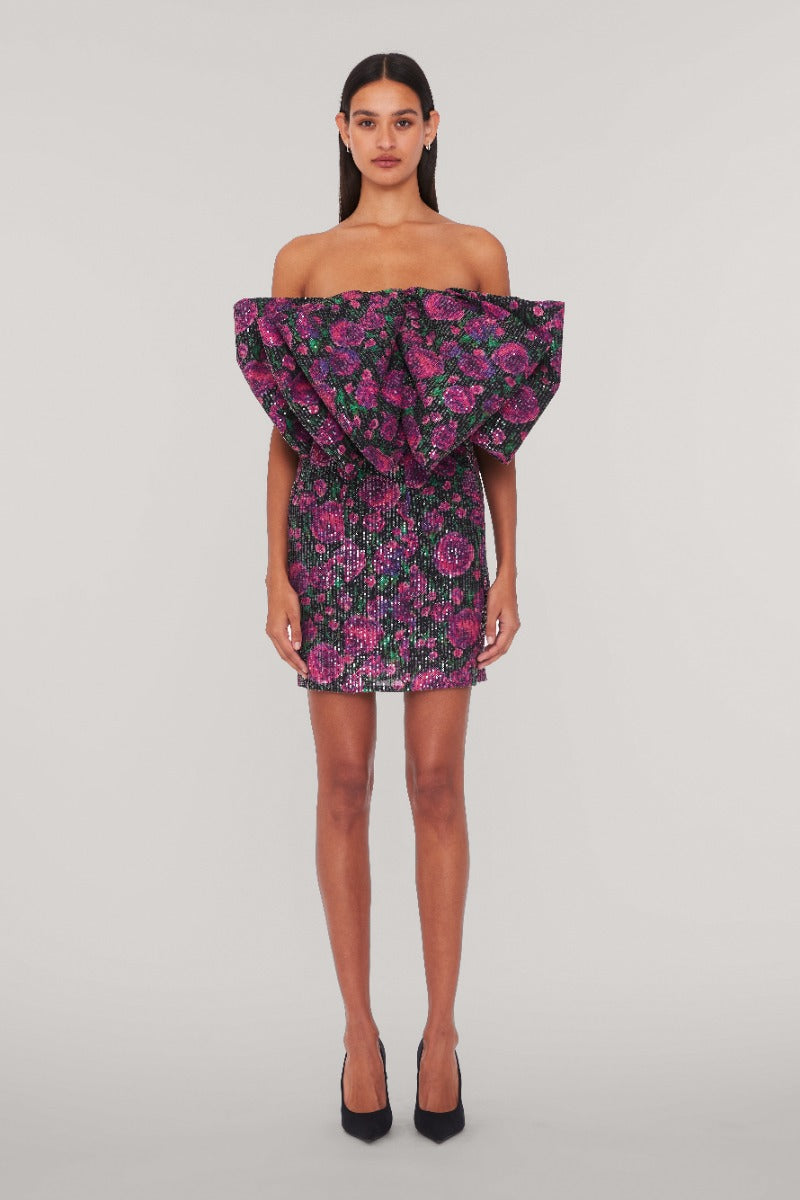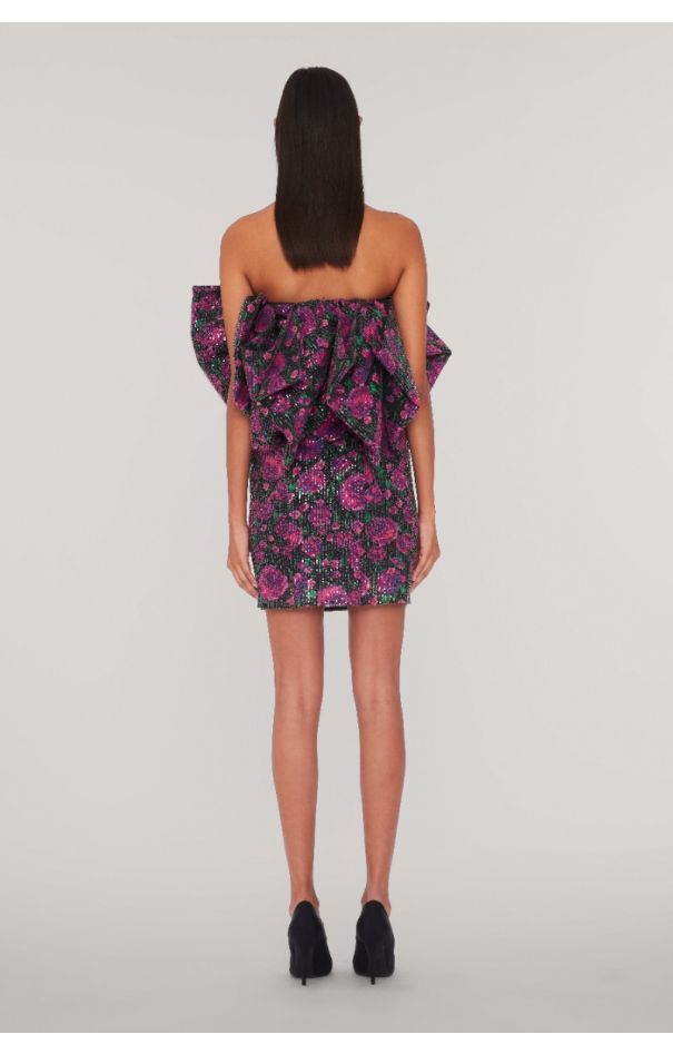 DISCOVER THE ELEGANCE OF THE SEQUINS MINI BOW DRESS. THIS MINI DRESS FEATURES A DRAMATIC BOW DETAIL AROUND THE BUST, A MINI FITTED SILHOUETTE AND A BACK ZIPPER. CRAFTED FROM A BEAUTIFUL SEQUINS MATERIAL IN 100% RECYCLED POLYESTER, THIS DRESS MAKES THE ULTIMATE CHOICE FOR ANY SPECIAL OCCASION.