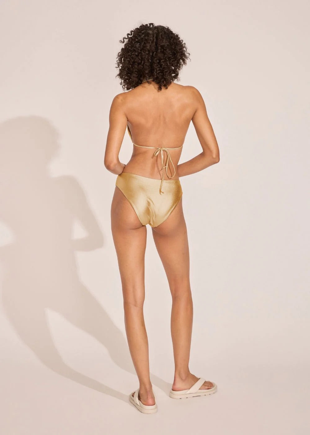 The Nani Bikini Top – a metallic marvel for your beach days. This halter top offers timeless style and support with moderate coverage. Pair with The Nani Bikini Bottom to complete the look, or with The Pia Bikini Bottom for cheekier coverage.