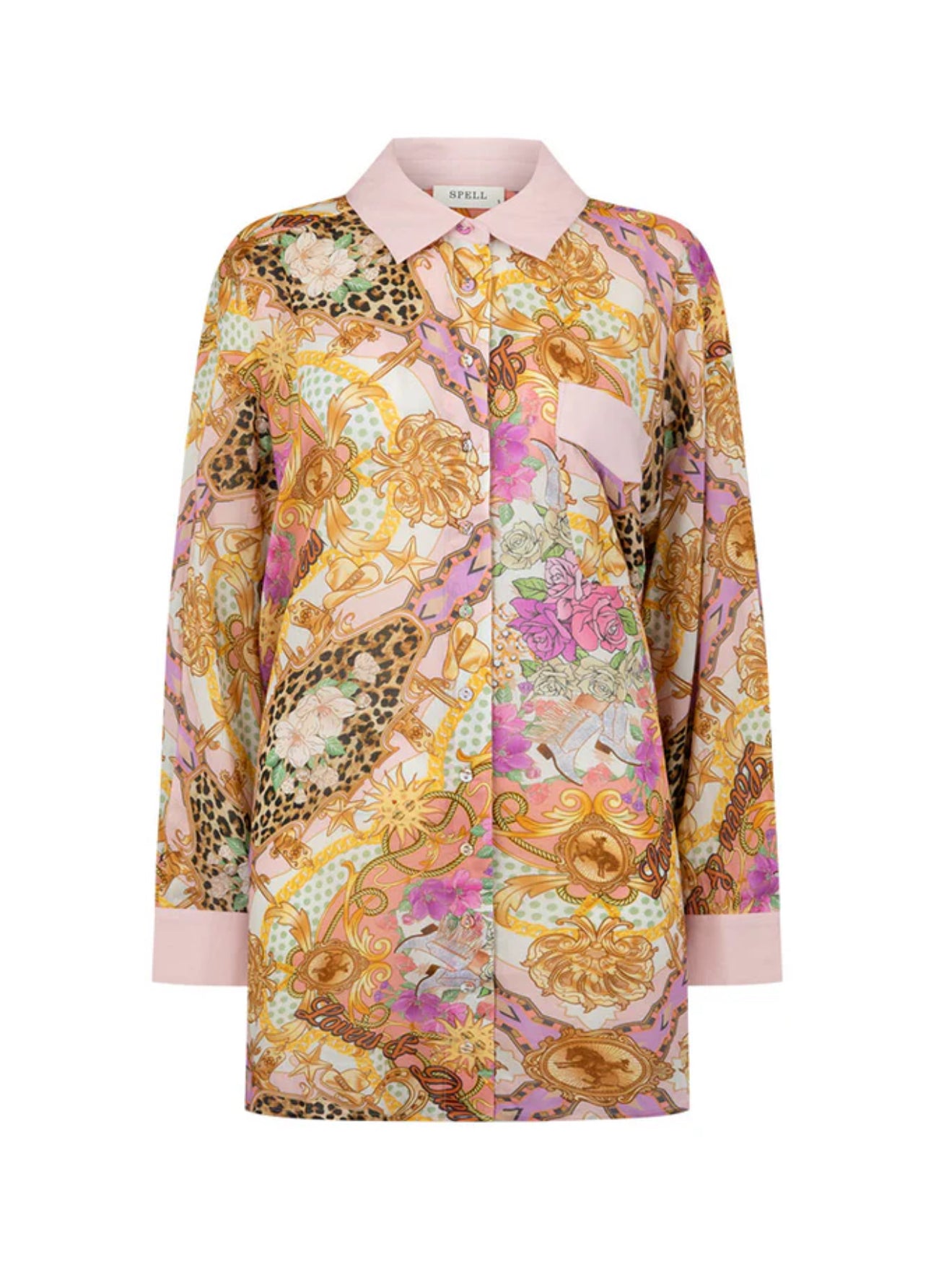 The Lovers & Dreamers Shirt in Champagne Peach redefines bold elegance with its daring contrast collar, pocket edge, and cuffs. Crafted from a custom Spell print fabric, this button-through shirt features self-covered buttons and a sleek chest pocket, blending classic tailoring with a fearless, modern edge. Perfect for those who live to stand out.