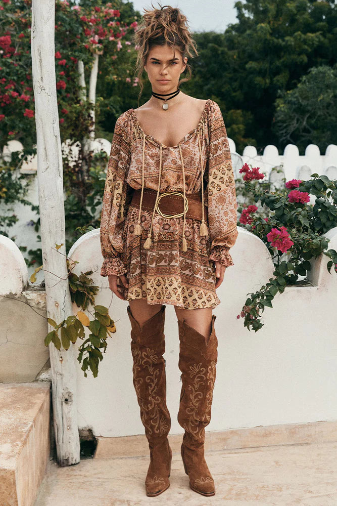 We can not get enough of our Lovers Beach Tunic Dress in Mauve. Crafted in a to die for Organic Cotton Crepe that floats over the body and featuring our mesmerising Lovers Beach print in dusty pinks and tonal tans and browns. Sure to become a Spell favourite style, our Tunic is elevated, and endlessly versatile ~ perfect for date nights, brunch with the girls or dancing under a star studded sky. We see our tunic paired with the Cabana Thigh Boots and Cabana Belt for some bohemian goddess glamor or with a simple slide for every day styling.