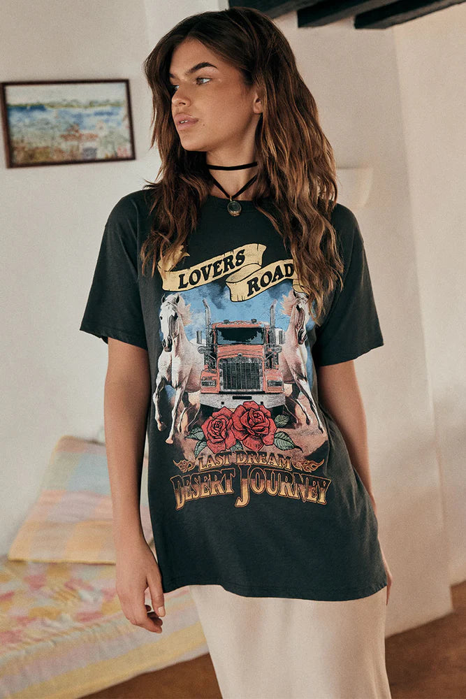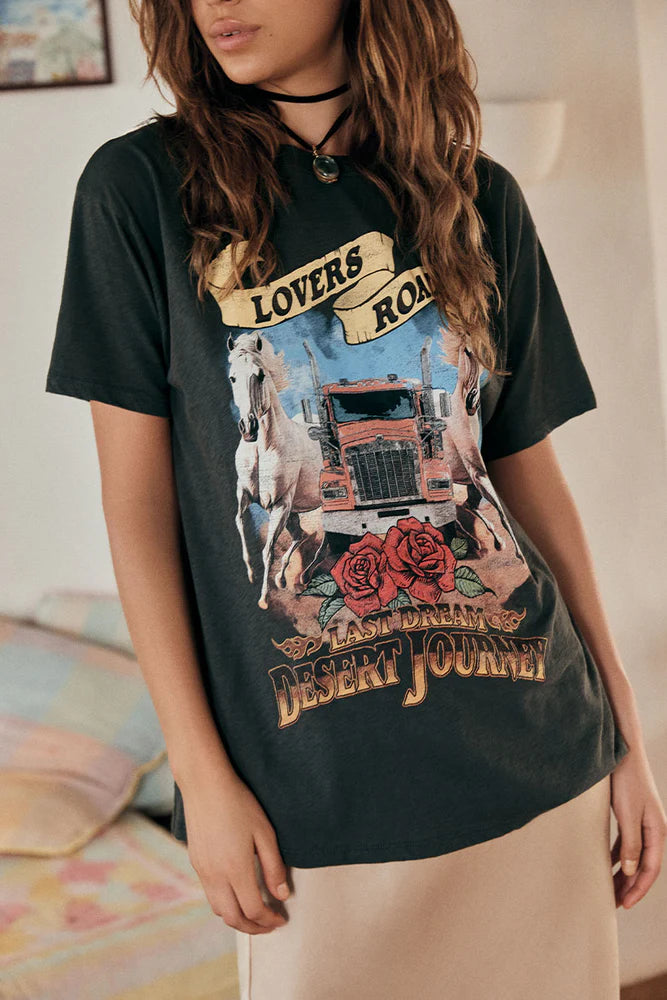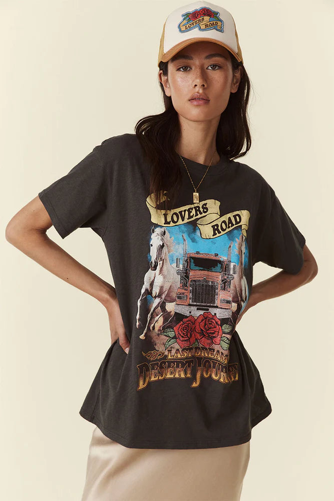 Our buttery soft Lovers Road Biker Tee in Charcoal is part femme, part rebel rocker with our oversized biker silhouette and hand drawn graphic featuring roses, a road train and wild horses. Sure to become a staple tee in your wardrobe, our Biker Tee pairs easily with any of your Spell skirts for some rock and roll glamour or with your favourite denim and slides for everyday street styling