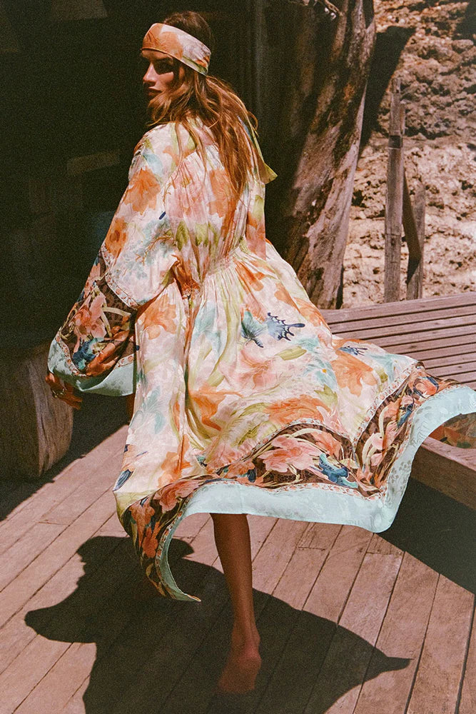 Our Painter’s Garden Gown in Seafoam evokes the romance of 1930’s vintage robes with silky, liquid like fabric, exquisite jacquard detailing and graceful watercolour florals and striking border details. With a silhouette that flows with every movement, this gown transforms languid mornings into unforgettable nights. Elevate the look with a slim heel and understated gold or pearl accessories for a glamorous, yet understated ensemble. Pair with boots and a lightweight cardigan for a more relaxed feel.