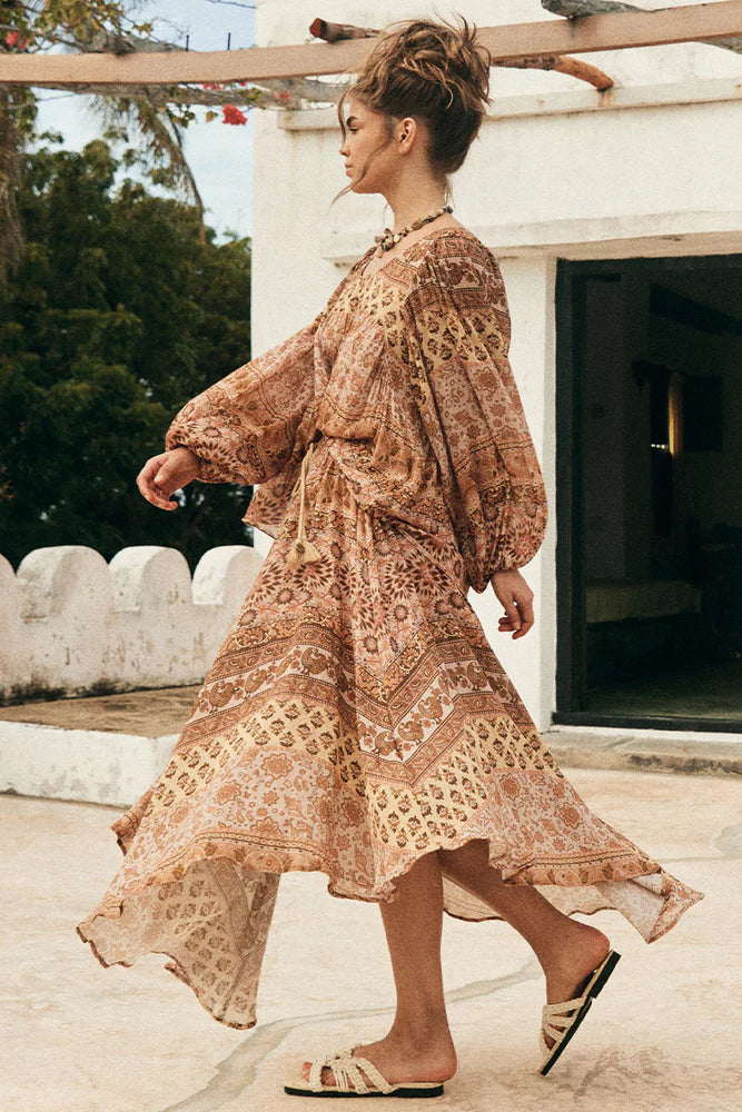 The Lovers Beach Midi Skirt in Mauve is striking in our hand drawn Lovers Beach print. Incredibly unique, our skirt features a pointed hemline reminiscent of our well loved Farrah Skirt, with custom charms and stunning border prints with motifs of exotic birds, rambling florals and geo patterns. This piece falls beautifully on the body and can be positioned high on the waist or lower on the hips. Pair our skirt with the Lovers Beach blouse for the ultimate in bohemian glamour or with a simple tank and slides for a more casual vibe. Endlessly versatile, we imagine our skirt twirling with the wearer under a star studded sky layered with leather and lace for the perfect festival fit.