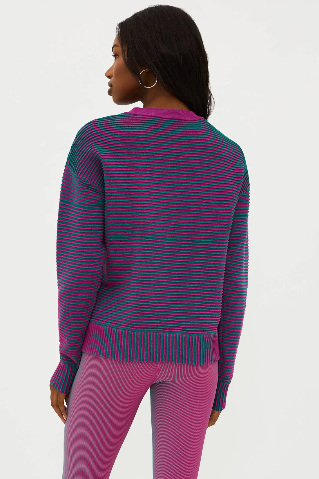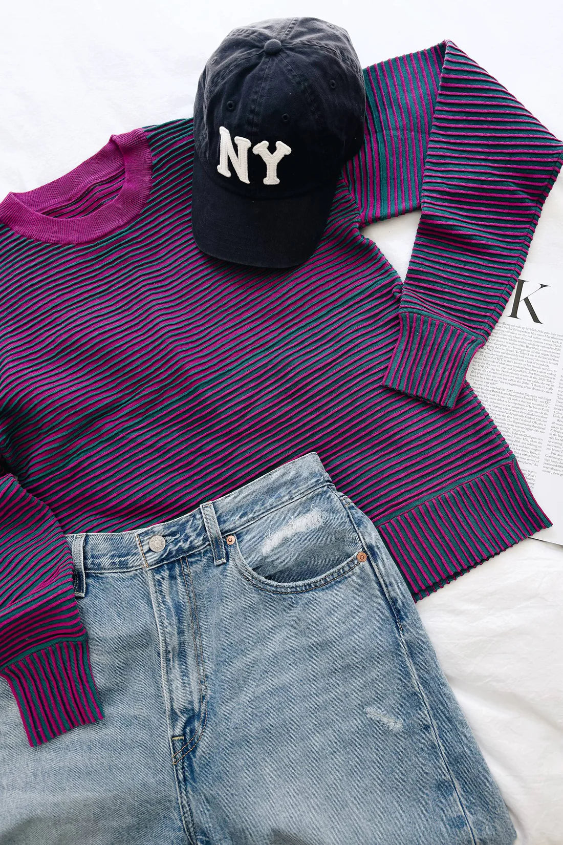 The Occulus Sweater is a pullover with a crew neckline and relaxed fit. This sweater features two-tone striping that changes direction on the hem, cuffs and neckline. Pair it with the matching Taylor Legging or your favorite pair of jeans. Size up if you want an oversized fit.