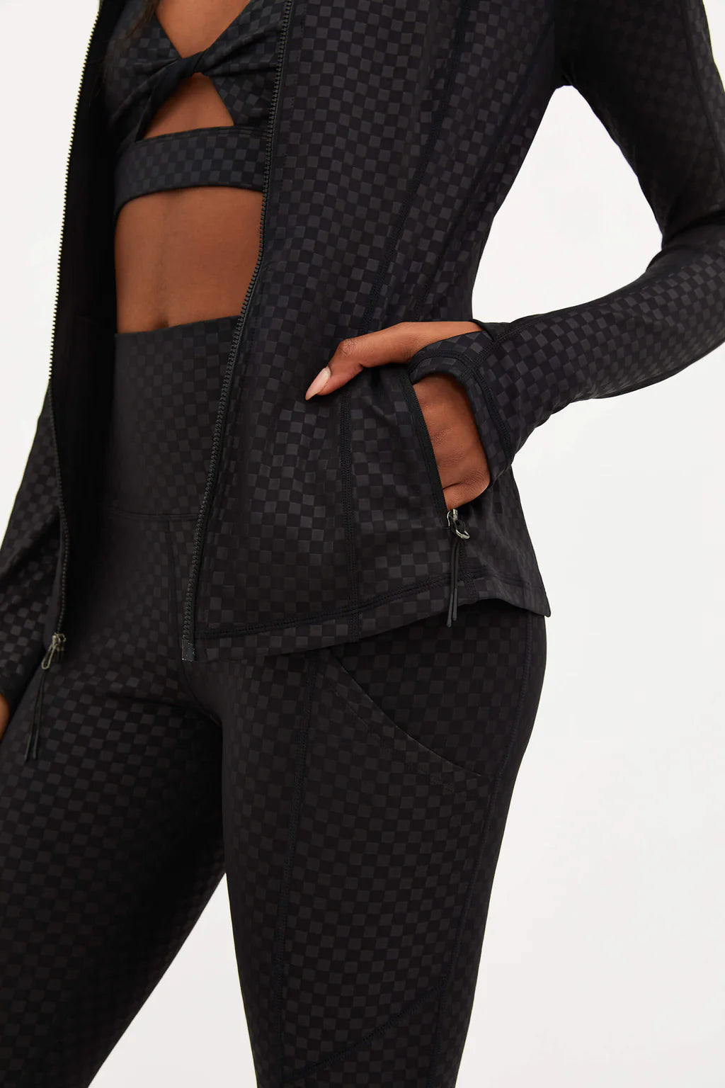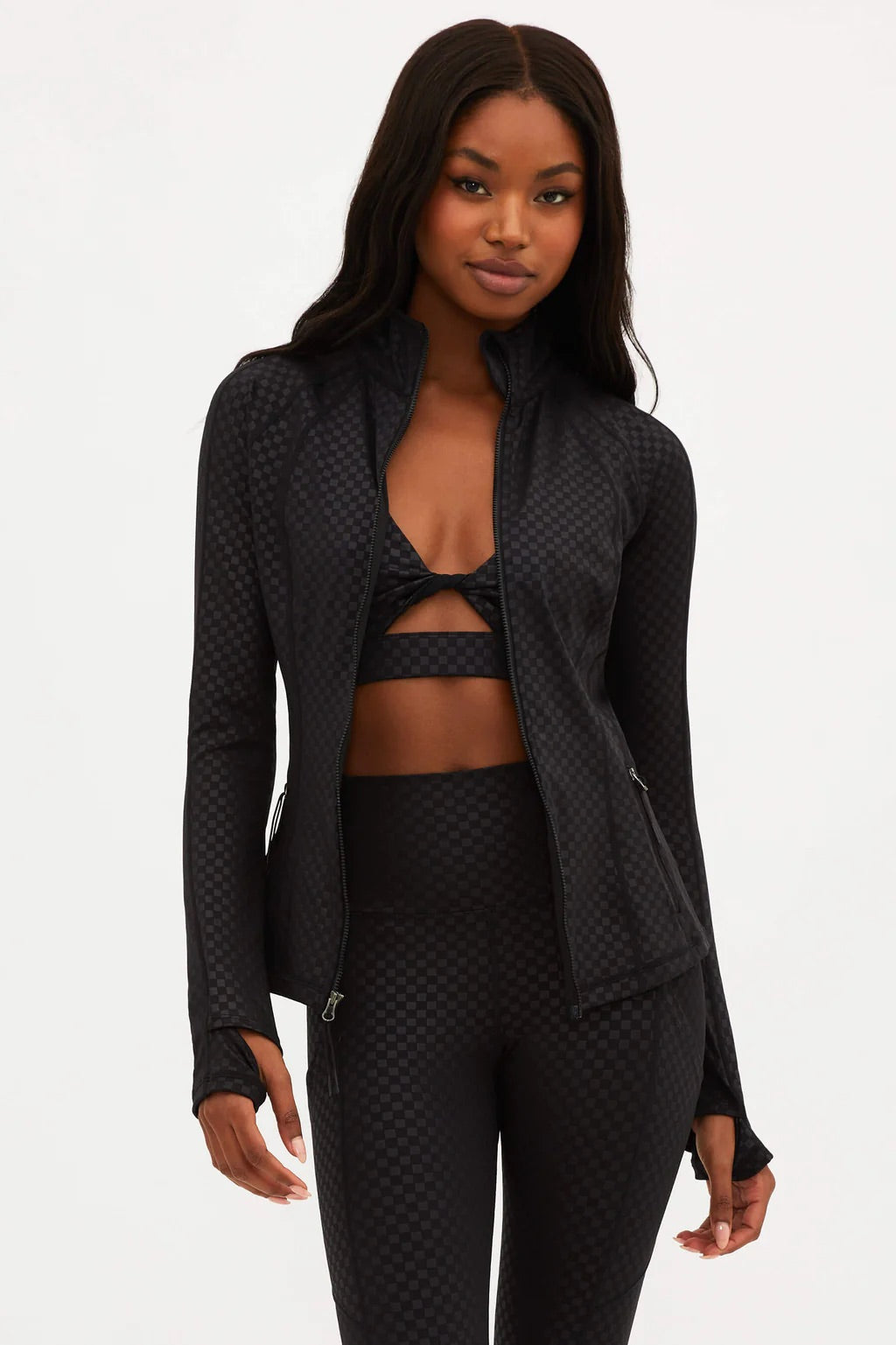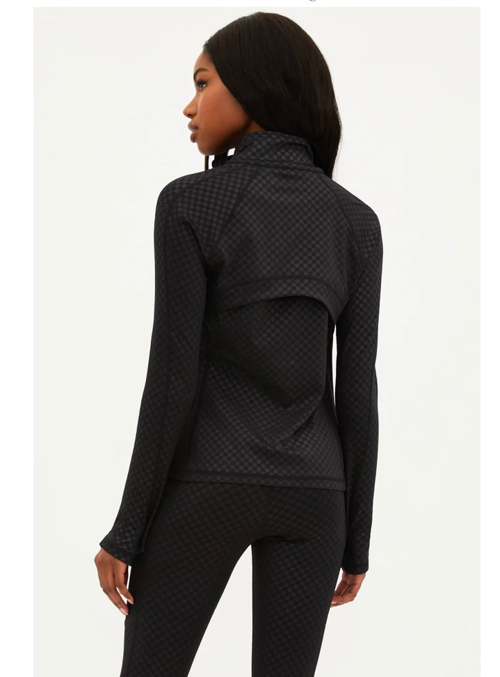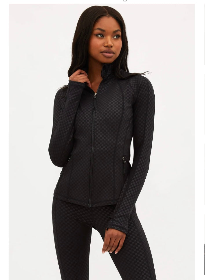 The Reina Jacket is our new sleek form-fitting running jacket. This jacket has ventilation in the back for airflow, moisture-wicking fabric, and thumbholes on the sleeves to keep your hands warm on your morning jog. With zipper pockets on the side to keep your belongings safe. The slim form-fitting silhouette provides a flattering fit and stays out of your way when you are on the move. Pair with the matching Twist Top and Summer Legging in the subtle but stunning embossed black check print.