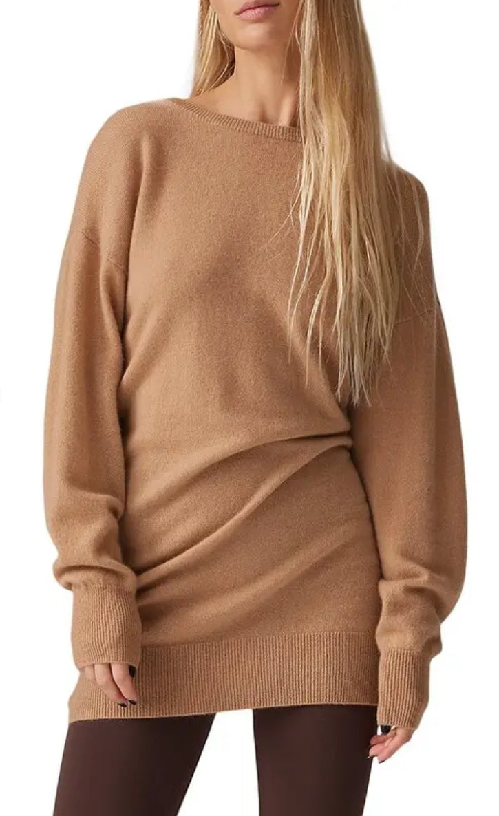 COLORUSH's Queen minidress is crafted of cashmere and designed with an open back. Bateau neckline Drop shoulders Long sleeves Ribbed trim Open back Pulls over 100% cashmere Hand wash Imported SIZE & FIT About 30.75" from shoulder to hem Model measurements: 5'10" tall Model is wearing a US size Small. COLORUSH. Color: Camel.
