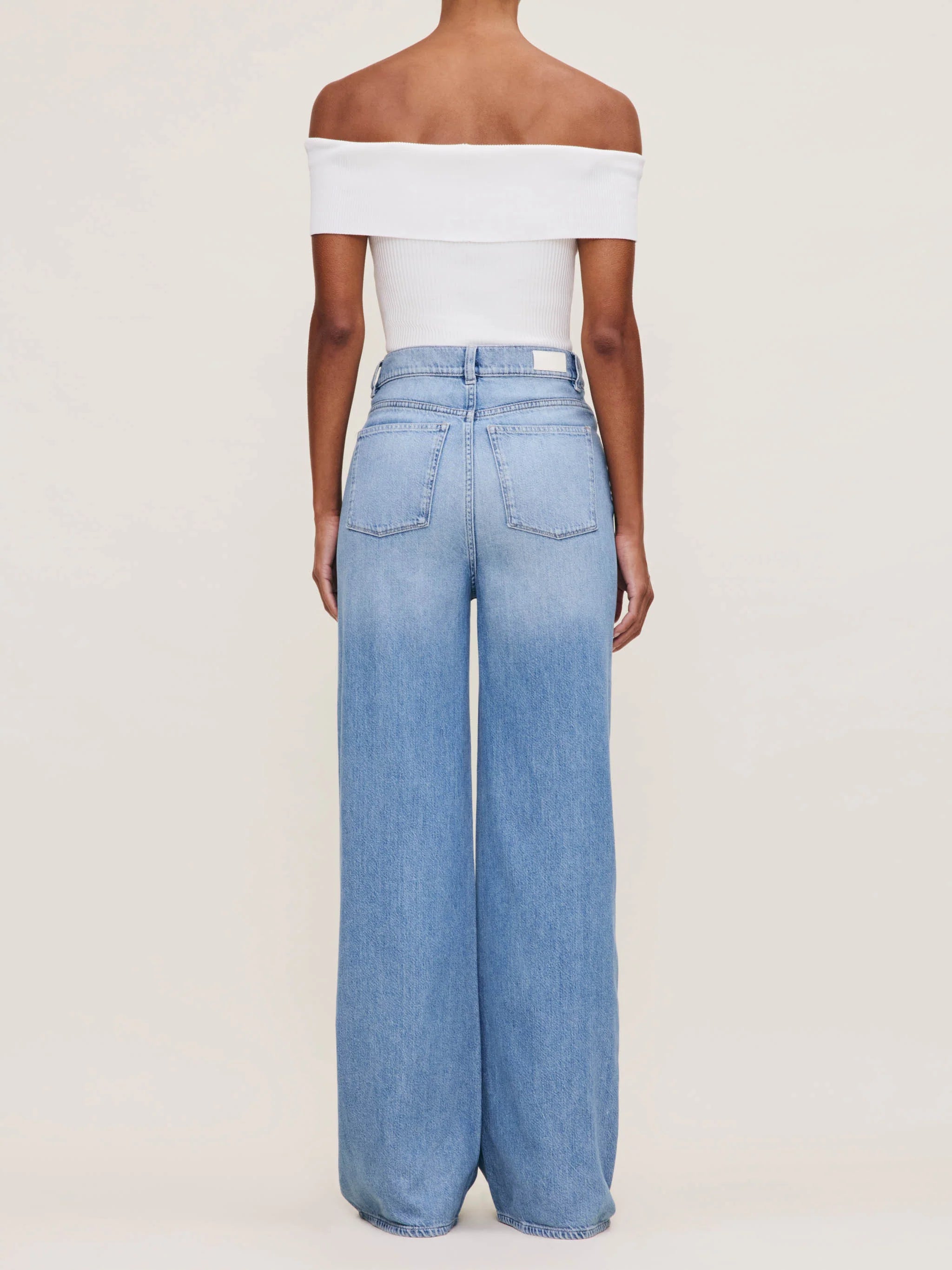 Hepburn is a vintage high-rise that is fitted through the waist and seat, tapering outward from the thigh for a wide leg with a 32" inseam.