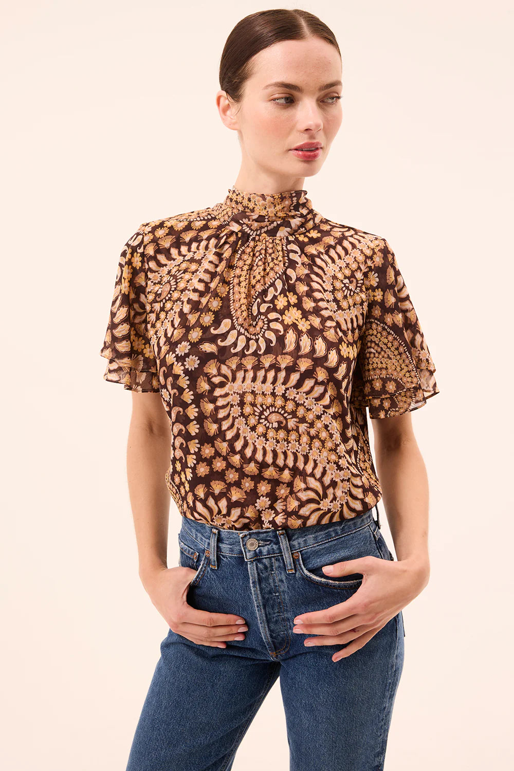 Kaye is an effortless high-neck top cut from our fall-ready Daisy Paisley chiffon. Designed with short double ruffled sleeves and a chic tie-back detail at the neck, it’s double lined for a smooth, flattering fit. Pair with the coordinating Agyness skirt for a head-to-toe look or dress it down with jeans.