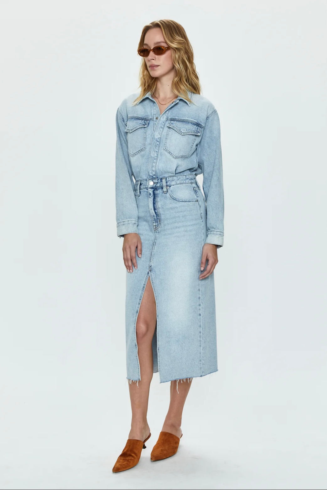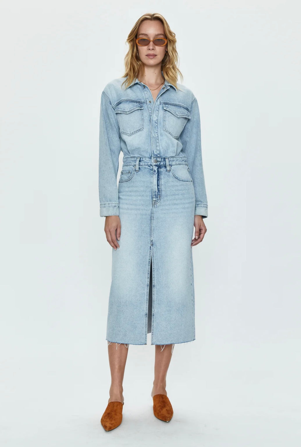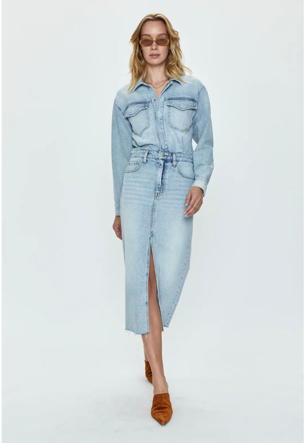An effortless one-and-done denim dress designed with a long sleeve top and midi length skirt. Hidden button closure and western inspired details accent the bodice, while a front slit opening and raw edge hem define the skirt.
