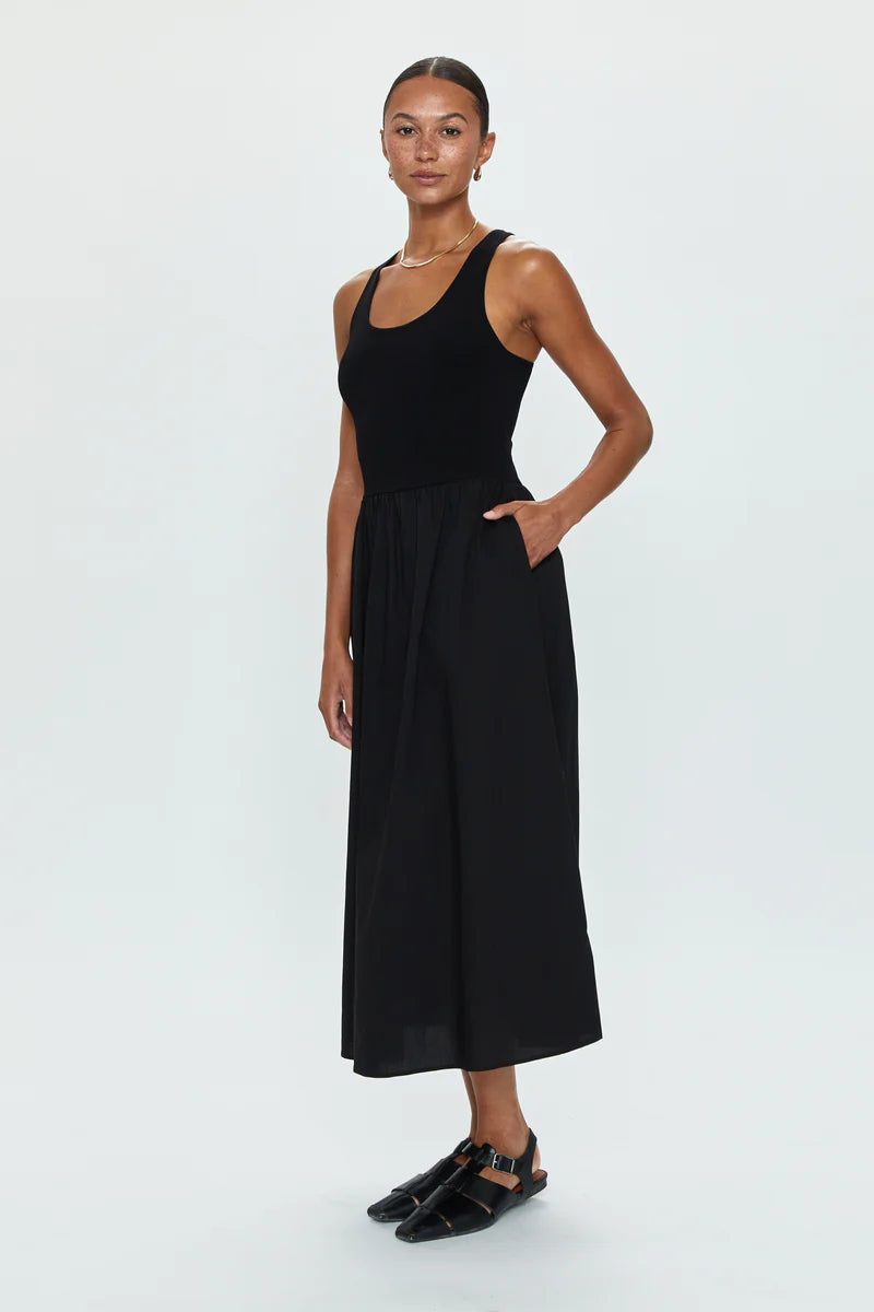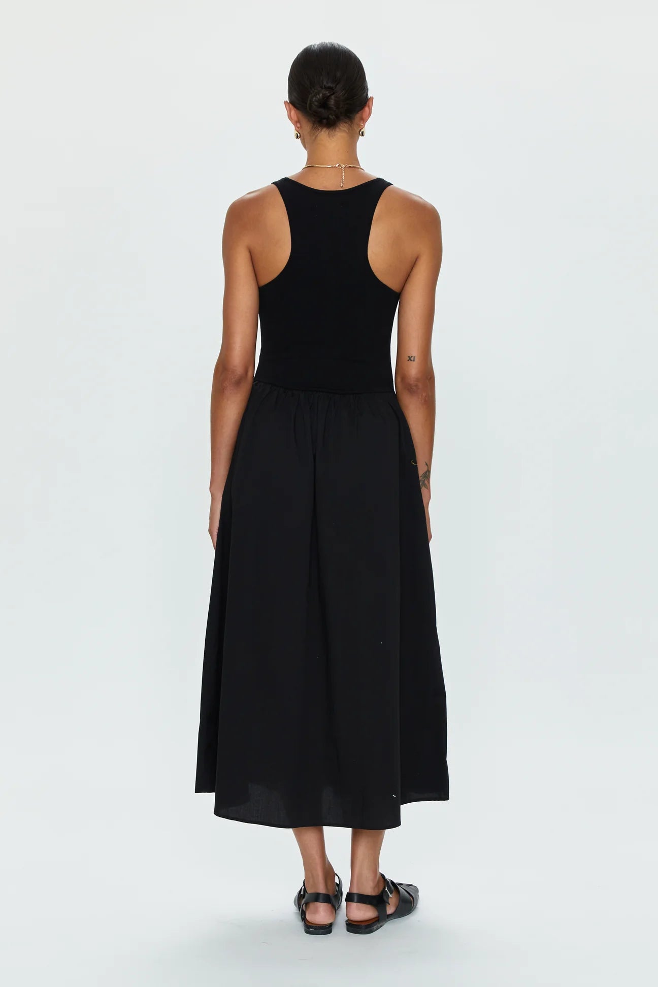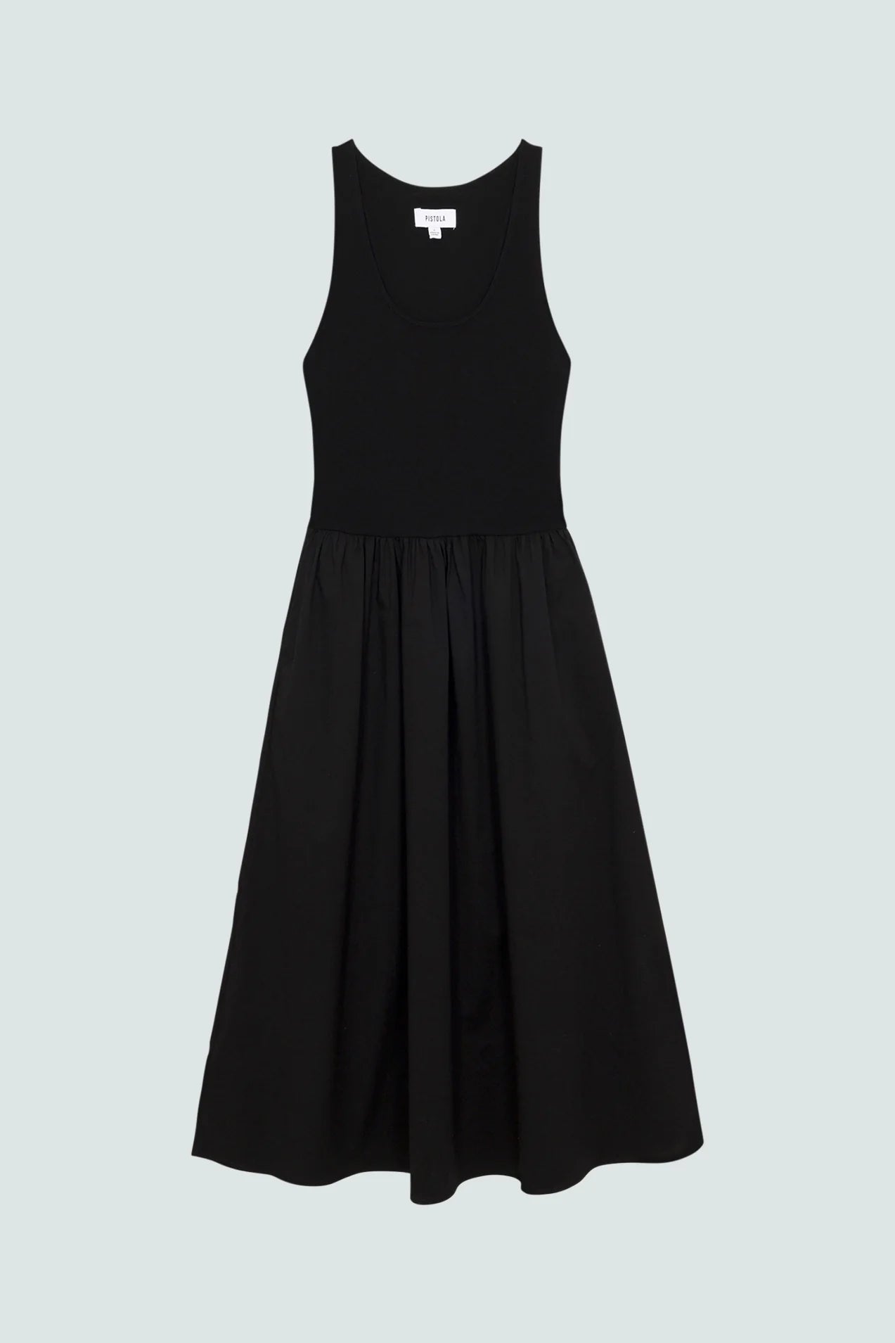 Rooted in elevated ease that dresses up or down for endless wearability. Designed with a compact tank style bodice that falls into a flounced, wide skirt with a midi length hem.