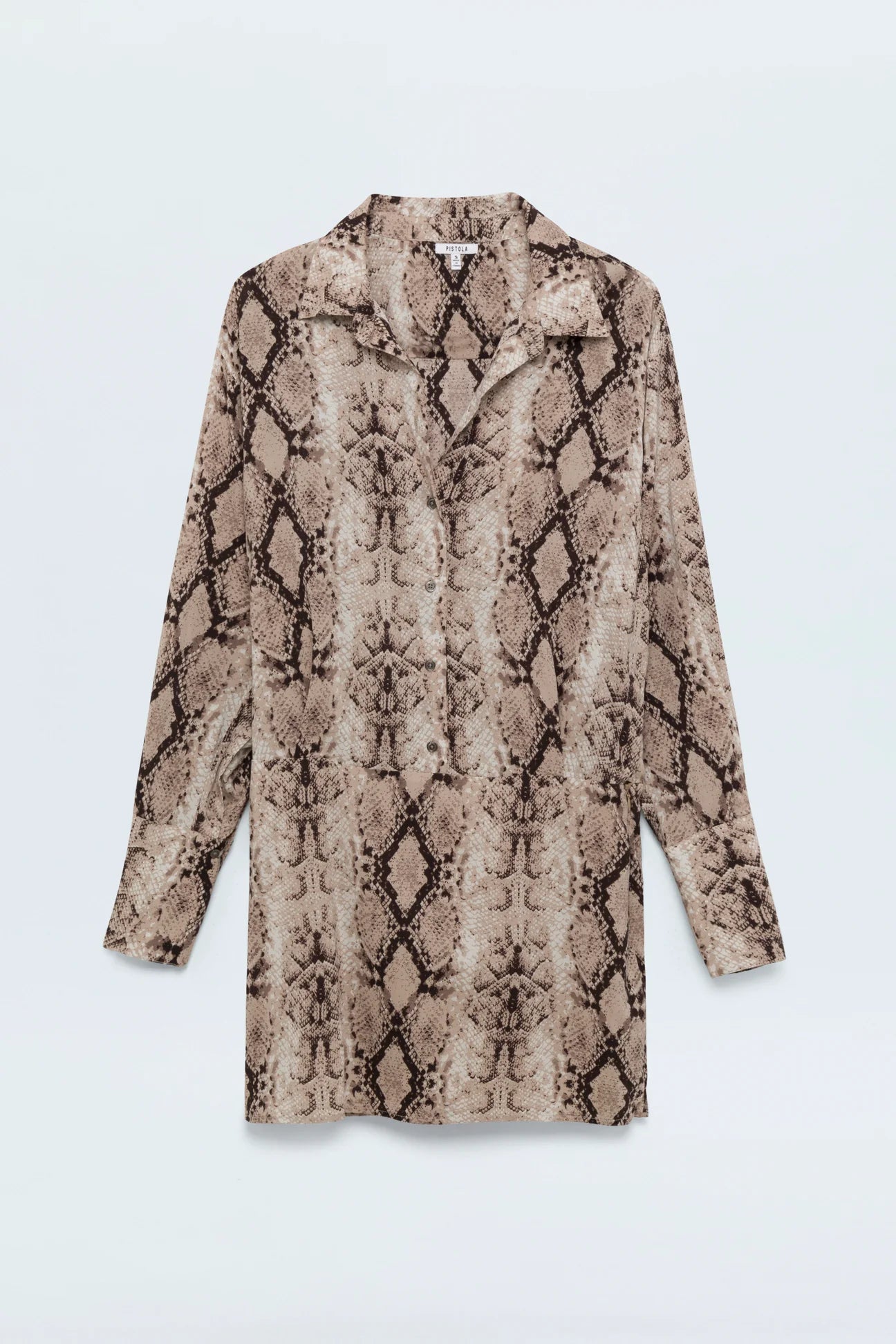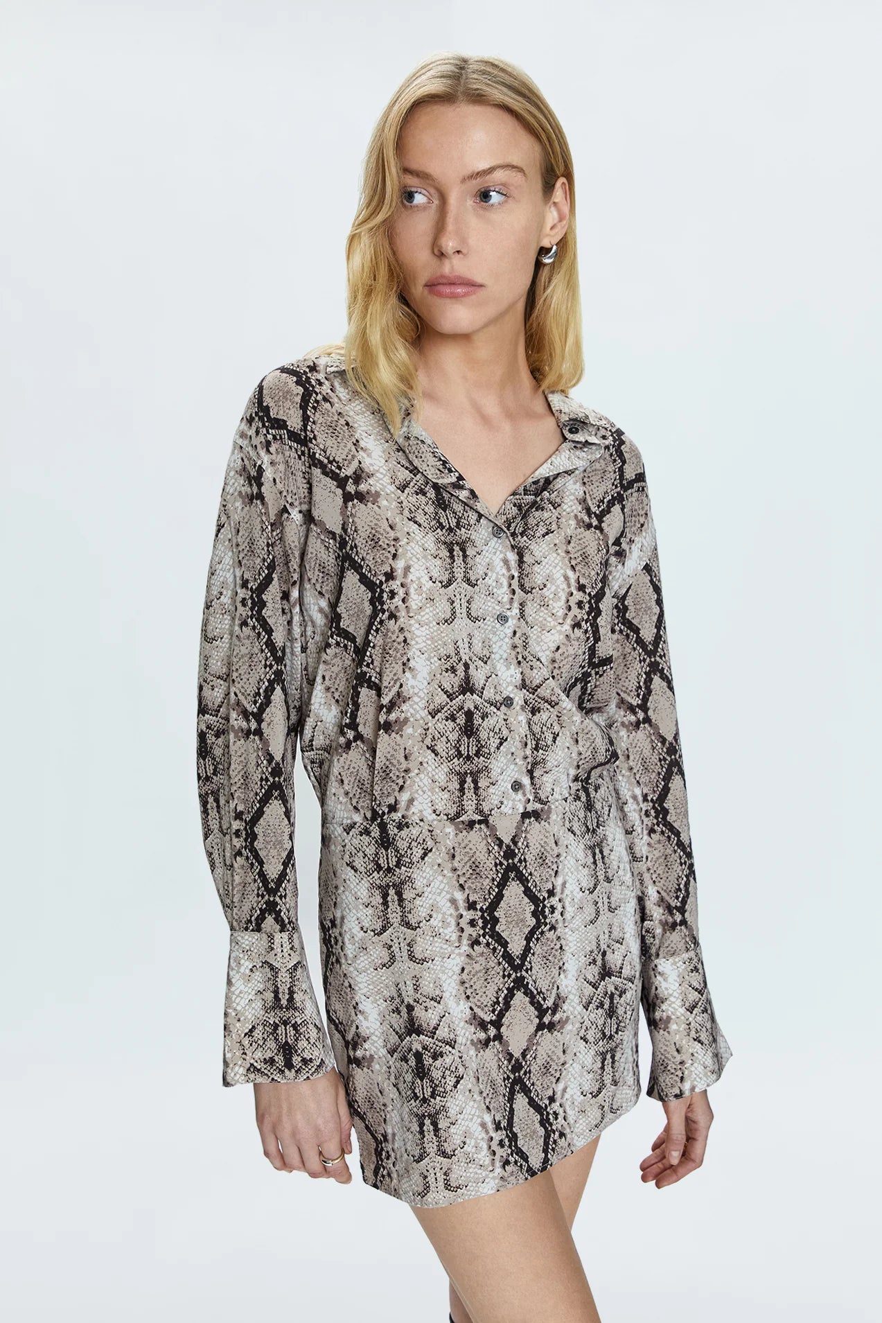 Breezy, lightweight shirt dress with and mini length skirt and adjustable drawstring waist. Shirting inspired bodice with collared neckline, center button closure, and cuffed long sleeves. Offered in an allover natural toned reptile print.