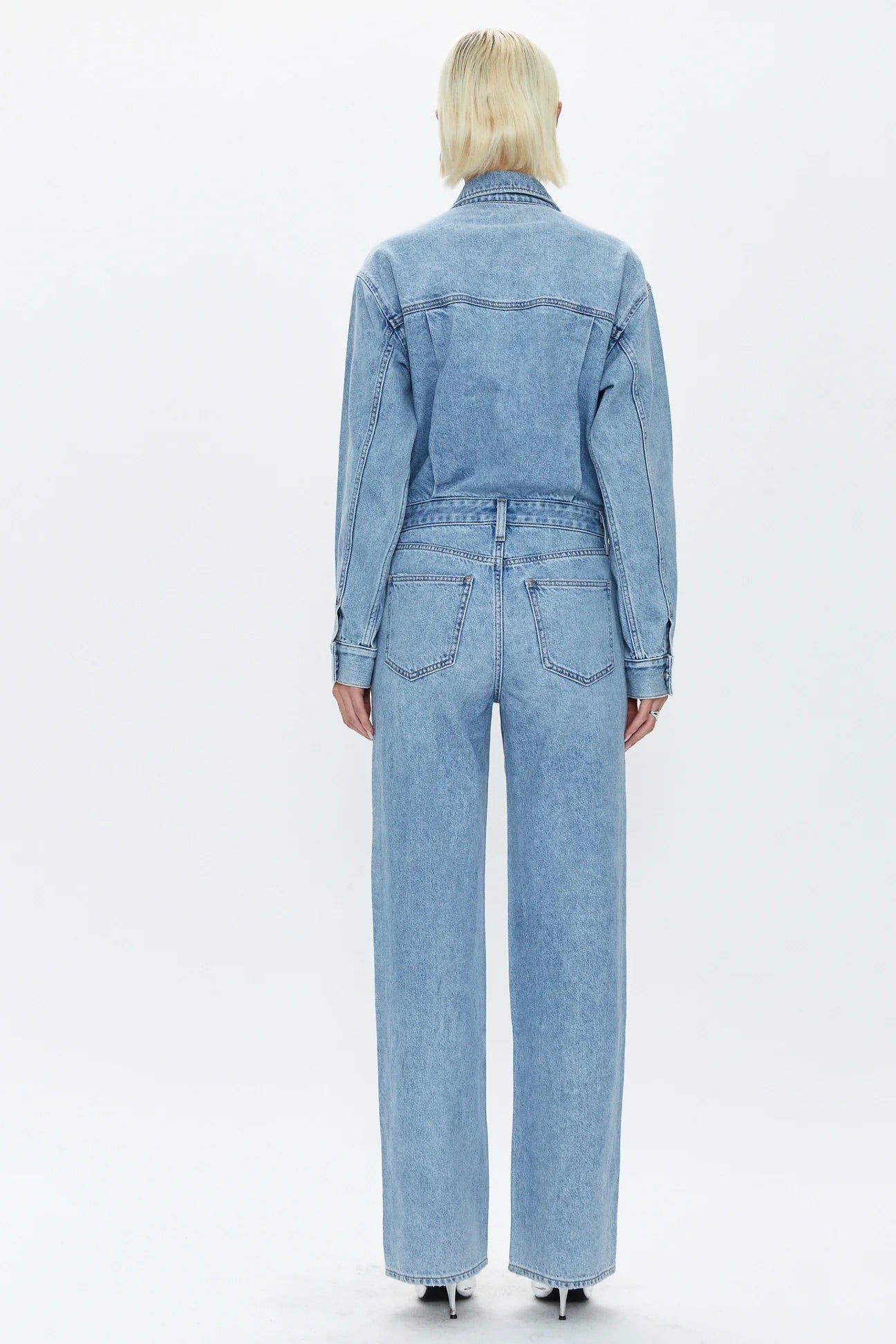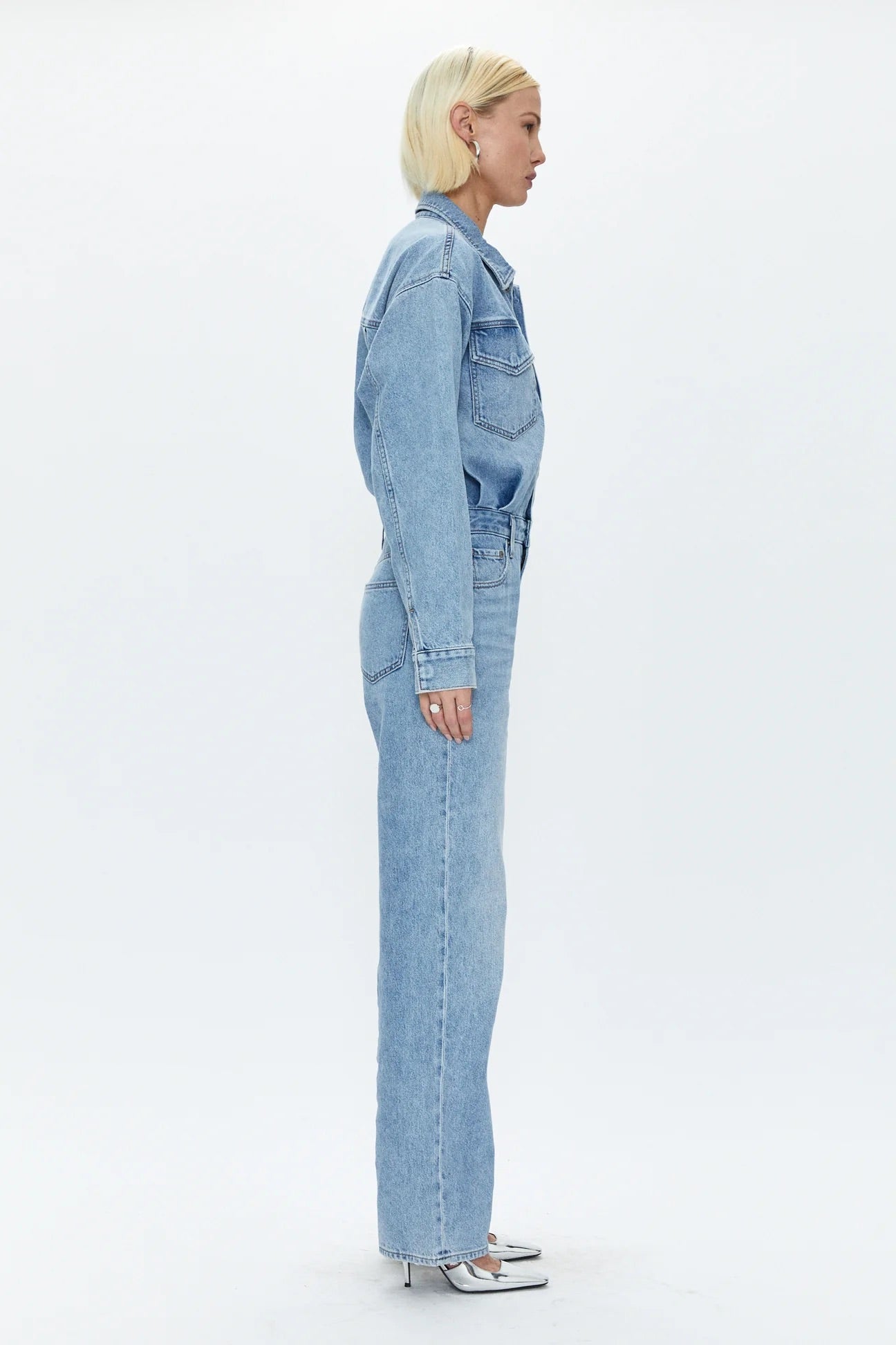 Little styling effort is needed in this head to toe denim look. This jumpsuit is cut from a medium wash denim with a clean front placket that has snap front closures on the top section and a zipper on the pant portion to make it appear like a true two piece set.