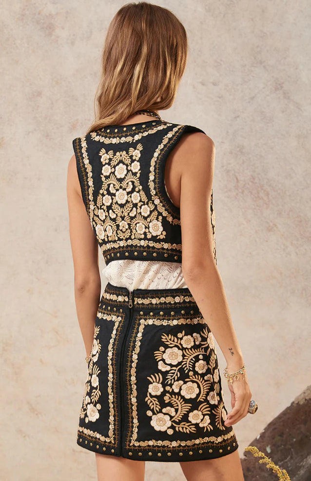 Experience the ultimate in edgy fashion with the Remi Vest in Midnight. Made from stretch linen, this vest features custom embroidery and hardware, adding a unique touch to your wardrobe. With a hook and eye closure at the front, it offers the perfect fit for the risk-taking rock and roll goddess in you!
