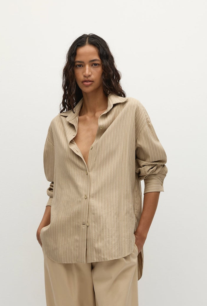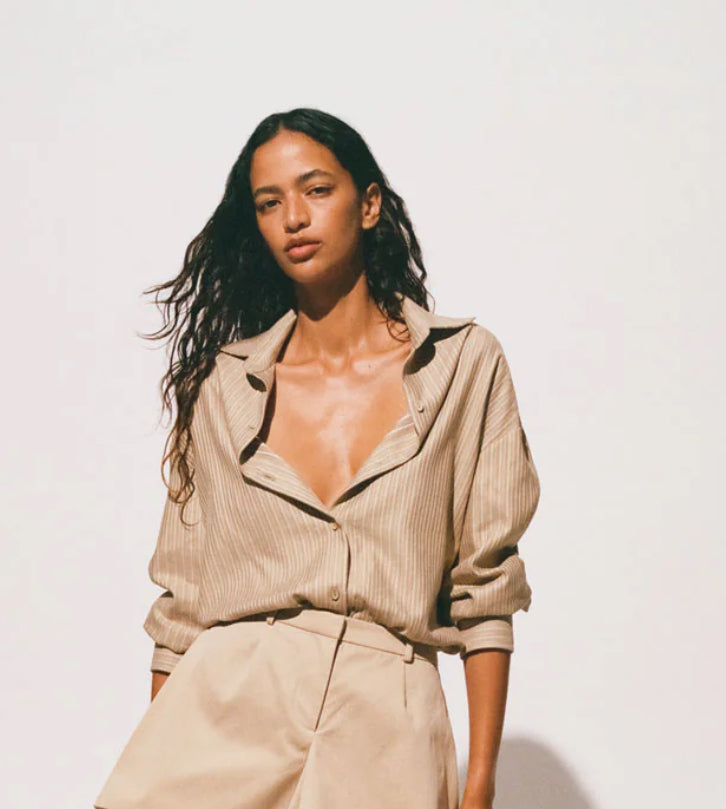 A boyfriend-style button-up shirt with an oversized fit and custom organic oval shape buttons, designed from an ultra-soft and unique blend of organic cotton and rayon in a neutral pinstripe. Its relaxed shape allows for versatility in styling and transeasonality. Tuck into the Sable Mini Skirt for a tailored approach to summer dressing.