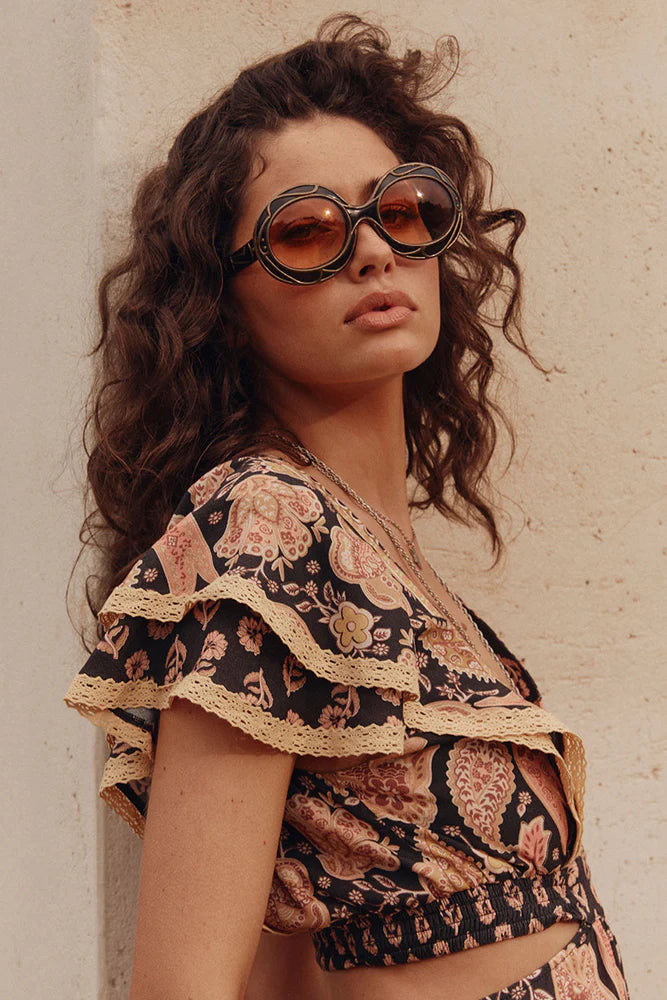 The Marmont Revelry Dress in Whiskey is the epitome of effortless elegance with a touch of bohemian flair. Featuring a bold allover print, this dress exudes a carefree yet refined charm. The border prints along the centre front, waist, and hem frill elevate the design, while the ruffles over the shoulders add a playful, feminine touch. The elastic back waist ensures a flattering, comfortable fit, and the skirt’s hem frill offers a flowy, free-spirited silhouette that moves with you. Dress it up with heels or pair it with boots for a more laid-back look. Whatever way you choose, this dress is ready to become your new favorite statement piece.
