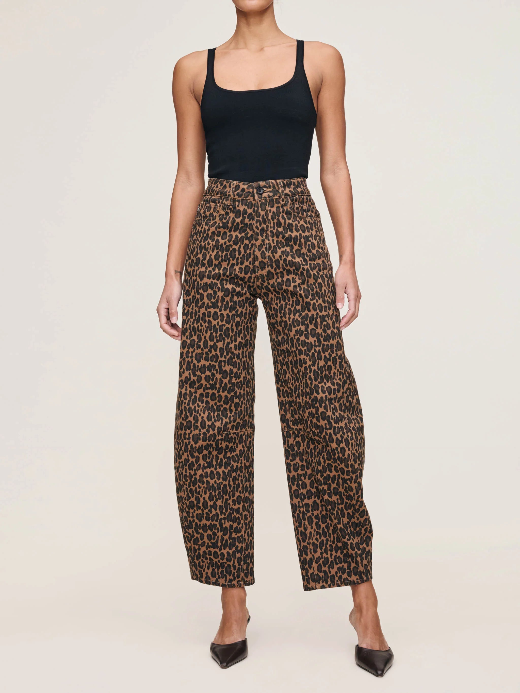 Miro is a high-rise, true barrel leg jean that is fitted at the hip and hits at ankle length, tapering at the leg.